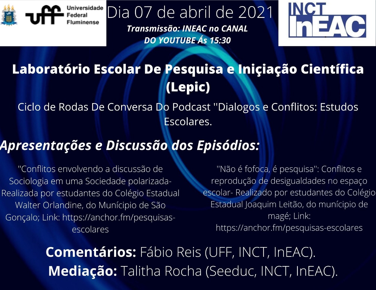 Nesta primeira Roda de Conversa, que será realizada no próximo dia 7 de abril, às 15:30, no canal INCT-InEAC no Youtube, serão apresentados e discutidos os episódios 8 e 11, respectivamente produzidos por estudantes do Colégio Estadual Joaquim Leitão, da cidade de Magé, e do Colégio Estadual Walter Orlandini, da cidade de São Gonçalo.  Como os podcasts não serão reproduzidos no momento da realização da Roda de Conversa (apenas apresentados e comentados), a ideia é que sejam ouvidos antes (Seguem os links abaixo). Contaremos, nesta ocasião, com os comentários do professor Fabio Reis Mota, do Departamento de Antropologia e do Programa de Pós-Graduação em Antropologia da UFF.