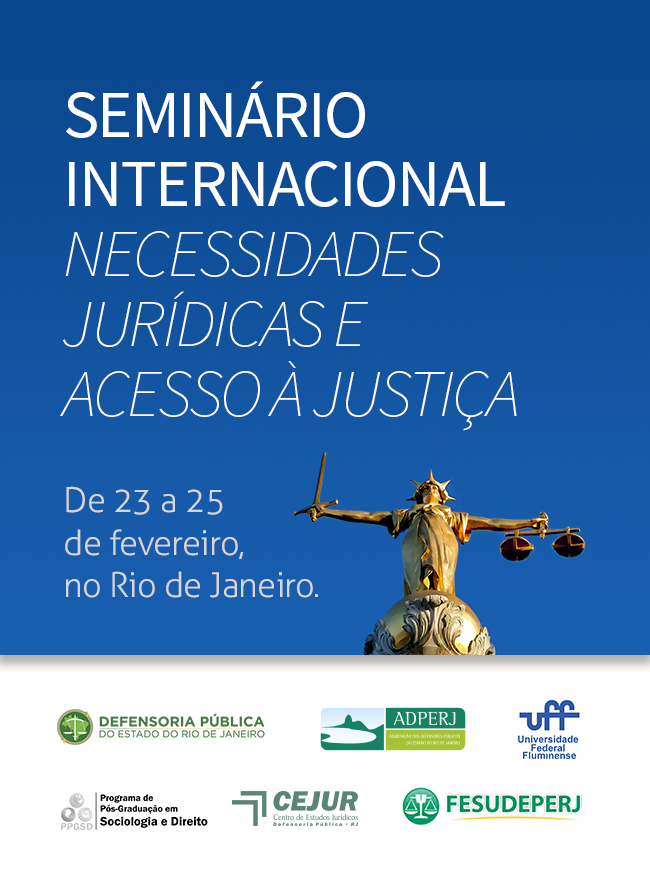 De 23 a 25 de fevereiro, acontece no Rio de Janeiro o Seminário Internacional sobre Necessidades Jurídicas e Acesso à Justiça. A iniciativa é do Grupo de Pesquisa “Defensoria Pública e Efetividade dos Direitos Fundamentais”, vinculado ao PPGSD-UFF e tem o apoio institucional da Defensoria Pública fluminense, da Associação dos Defensores Públicos do Rio de Janeiro, a ADPERJ e do programa “Santander Universities”.