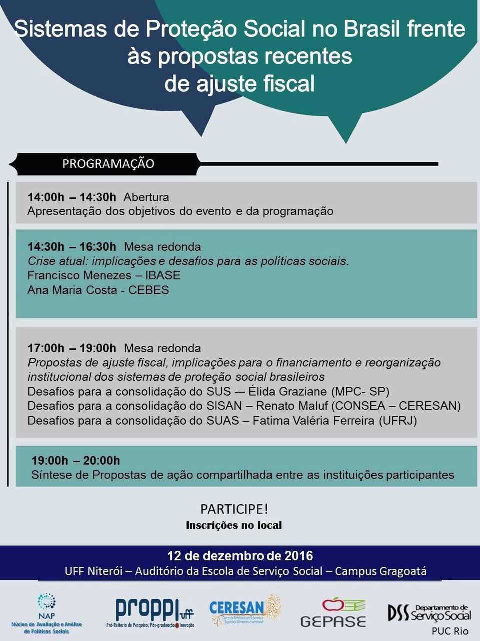 O Programa de Estudos Pós Graduados em Política Social da Universidade Federal Fluminense, por meio do Núcleo de Avaliação e Análise de Políticas Sociais (NAP), em parceria com o Centro de Referência em Segurança Alimentar e Nutricional (CERESAN/CPDA-UFRRJ/UFF), com o Grupo de Ensino, Extensão e Pesquisa em Saúde e Alimentação (GEPASE/UFF) e com o Grupo de Pesquisa Estado, Sociedade, Políticas e Direitos Sociais (GESPD/PUC-RJ) convidam para o Seminário: Sistemas de Proteção Social no Brasil frente às propostas recentes de ajuste fiscal, a ser realizado aos 12 dias do mês de dezembro de 2016 às 14:00h, no Auditório da Escola de Serviço Social, Campus Gragoatá. Inscrições no local