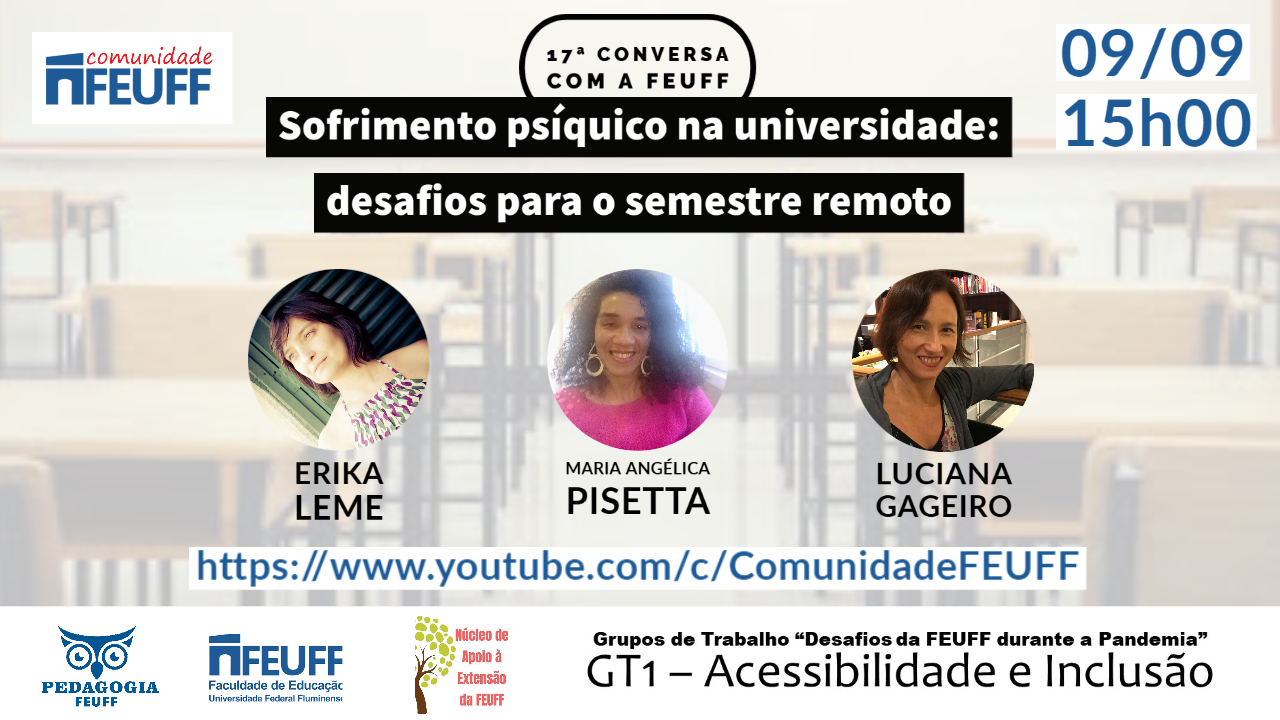 A 17ª Conversa com a FEUFF terá como tema “Sofrimento psíquico na universidade: desafios para o semestre remoto”. Contaremos com as nossas colegas Erika Leme, Maria Angélica Pisetta e Luciana Gageiro como debatedoras. Uma conversa importantíssima para pensarmos juntos os desafios para o semestre remoto que inicia na próxima semana.