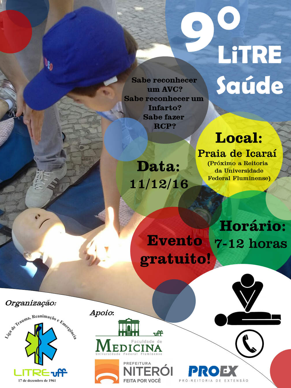A Liga de Trauma, Reanimação e Emergência da Universidade Federal Fluminense (LiTRE-UFF) convida toda a comunidade para participar do “9º LiTRE Saúde”. O LiTRE Saúde é uma atividade de extensão universitária realizada anualmente na Praia de Icaraí. No evento os transeuntes têm a oportunidade de aprender sobre suporte básico de vida (BLS), reanimação cardiopulmonar (RCP), sinais para reconhecimento de acidente vascular encefálico (AVE) e do infarto agudo do miocárdio (IAM). Ao longo de mais de 8 anos de projeto, estima-se que mais de 3500 pessoas tenham recebido as informações fundamentais para o rápido reconhecimento destas situações de emergência e o acionamento do serviço médico. O pedido rápido de ajuda tem significativo impacto sobre a sobrevida e a qualidade de vida da vítima.