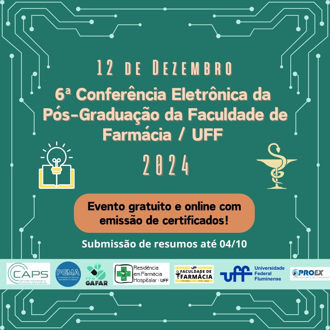 No dia 12 de dezembro, ocorrerá a 6ª Conferência da Pós-Graduação da Faculdade de Farmácia da UFF. O evento contará com um dia de palestras online (canal do YouTube da Faculdade de Farmácia) em diversas áreas da Farmácia, incluindo palestrantes internacionais. Também haverá submissão de resumos e apresentação de trabalhos.