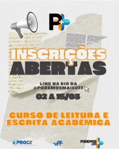 A Pró-Reitoria de Extensão da Universidade Federal Fluminense informa que estão abertas, entre os dias 02 e 15 de março, as inscrições para a 10ª edição do Projeto Podemos Mais UFF – Curso de Leitura e Escrita Acadêmica.