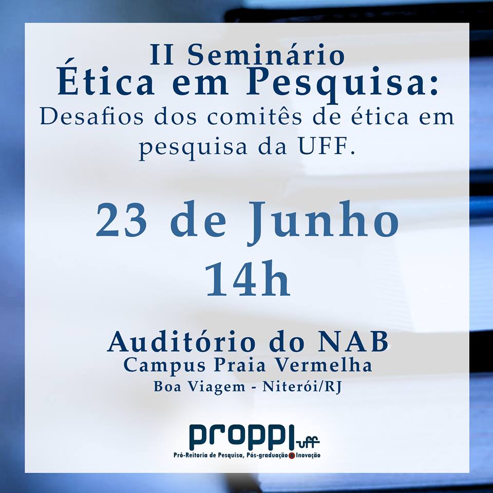 A PROPPI informa a data para o 3º encontro do Seminário Ética em Pesquisa: Desafios dos comitês de ética em pesquisa da UFF, que será realizado no dia 23/06, de as 14h, no Auditório do NAB, Praia Vermelha, em Niterói.