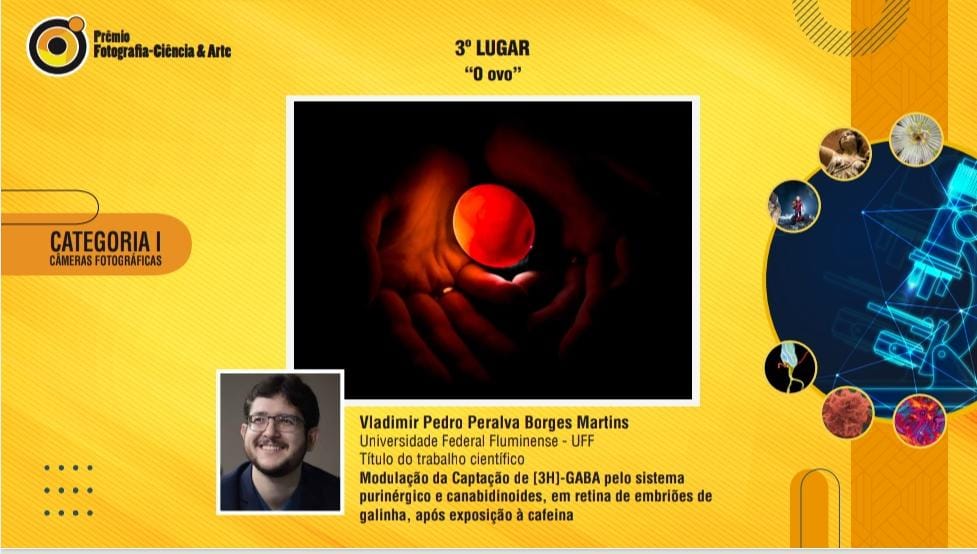 Vladimir Pedro Peralva Borges Martins, estudante do Programa de Pós-Graduação em Neurociência da Universidade Federal Fluminense, foi destaque no 12º Prêmio de Fotografia do Conselho Nacional de Desenvolvimento Científico e Tecnológico (CNPq), que tem como objetivo prestigiar cientistas em diferentes níveis de ensino através da cultura e arte expostas em fotografias.