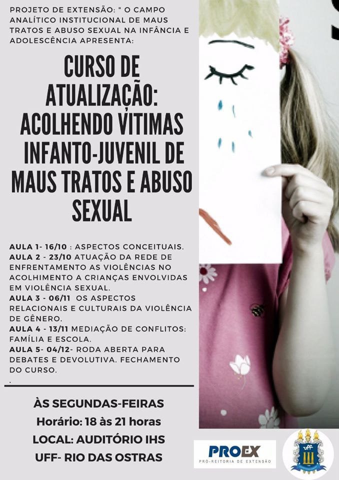 O Projeto de Extensão “Campo analítico institucional dos maus tratos e abuso sexual na infância e adolescência” do Campus UFF de Rio das Ostras (Curo) estará com inscrições abertas até o dia 15 de outubro para o curso de atualização “Acolhendo vítimas infanto-juvenil de maus tratos e abuso sexual”.