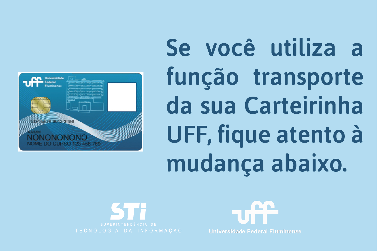 A Carteirinha da UFF terá a função de cartão de passagem desabilitada. Os alunos que utilizam essa função devem procurar um posto de atendimento da Riocard Mais para efetuar a transferência de informações da carteirinha para o novo cartão de passagem. A migração das informações estará disponível até o dia 31 de outubro.
