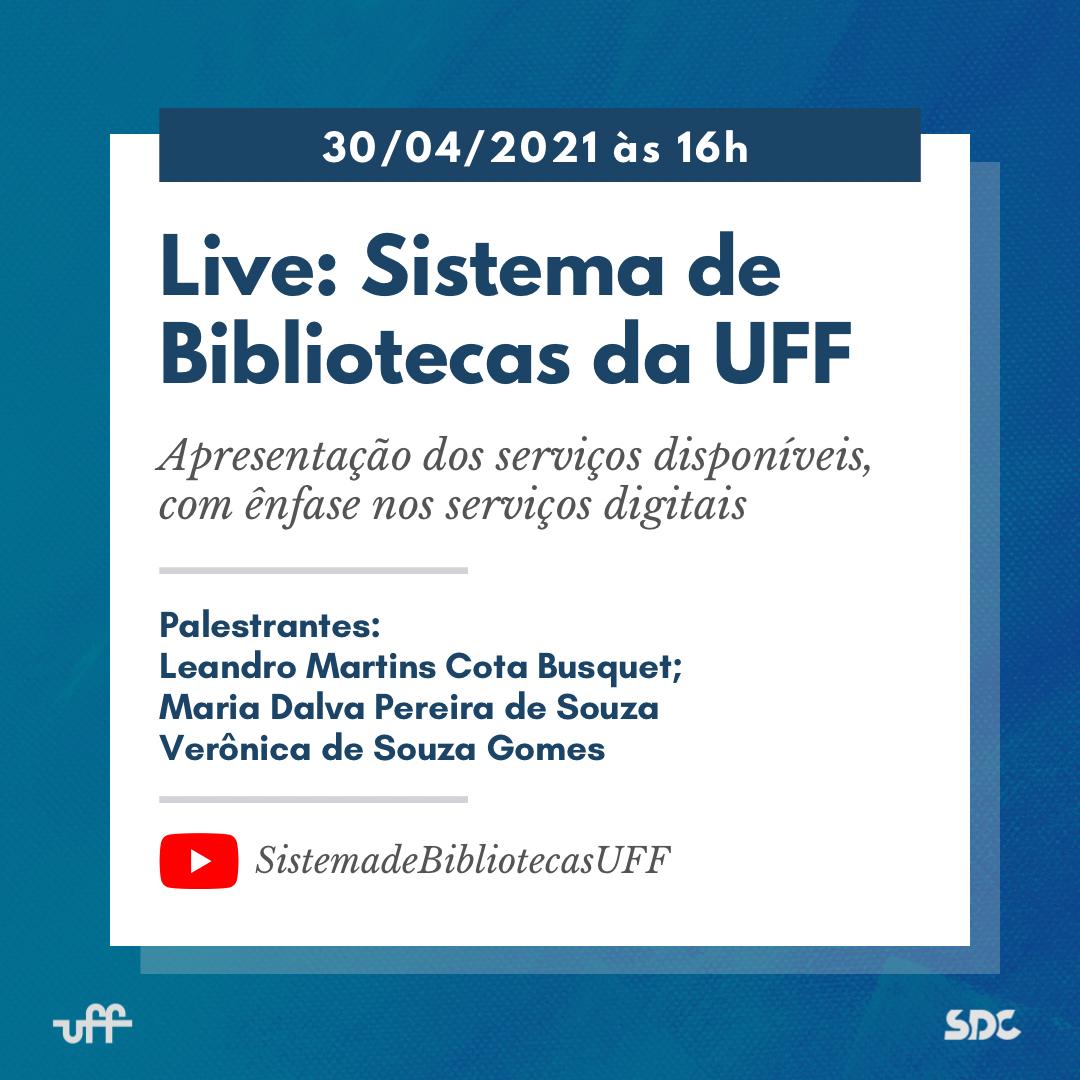 O Sistema de Bibliotecas da UFF realizará no dia 30/04/2021 às 16h evento on-line ao vivo (live) de apresentação dos Sistema e dos serviços disponíveis para todos os usuários, com ênfase nos serviços digitais nesse momento de pandemia.