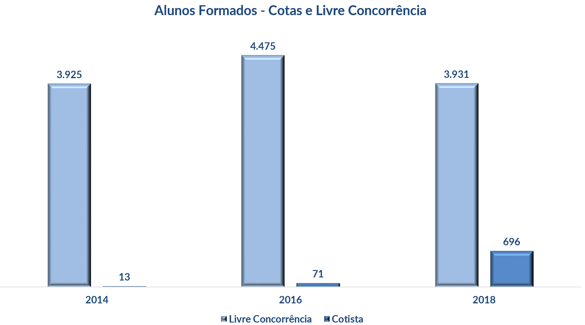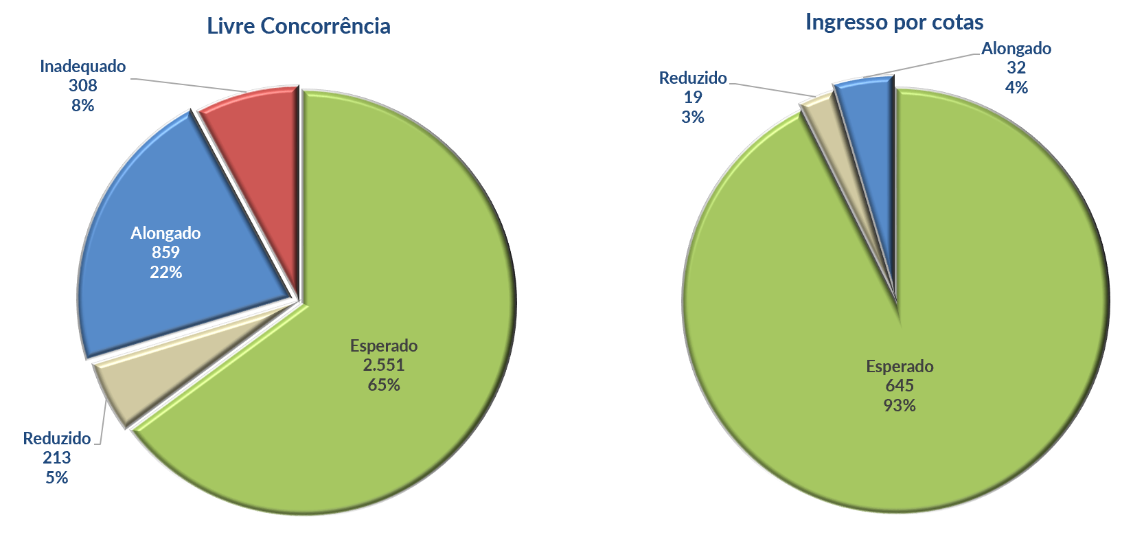 | Em 2018, enquanto 93% dos cotistas se formaram no tempo esperado, este percentual foi de 65% entre os alunos que ingressaram pela livre concorrência. | |||