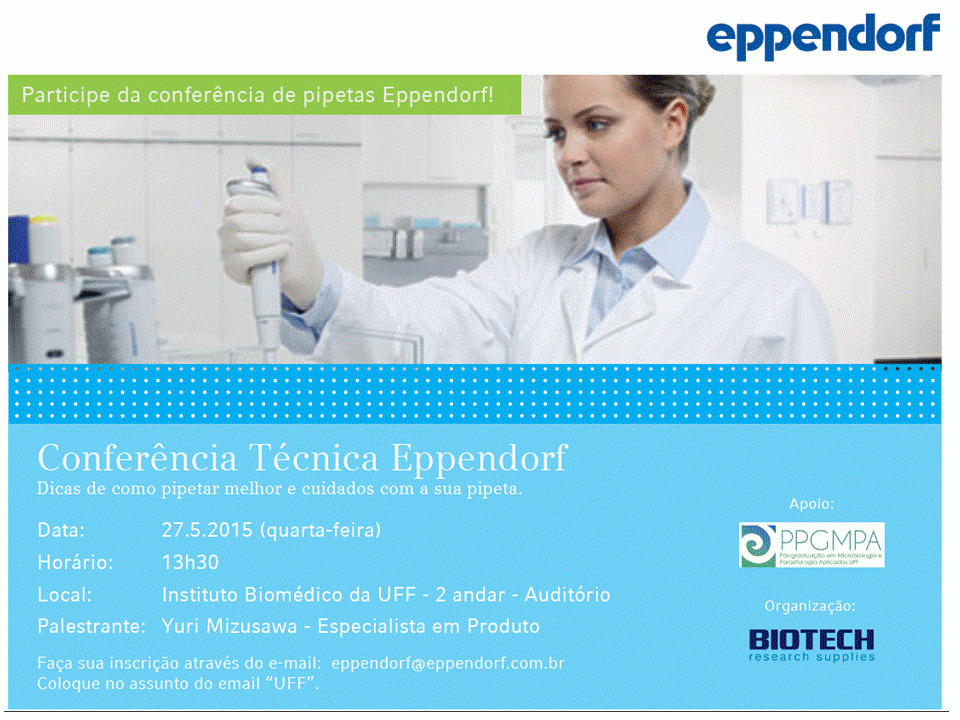 As inscrições devem ser feitas pelo e-mail eppendorf@eppendorf.com.br, colocando-se “UFF” no assunto. Haverá coffee break e sorteio de brindes.
