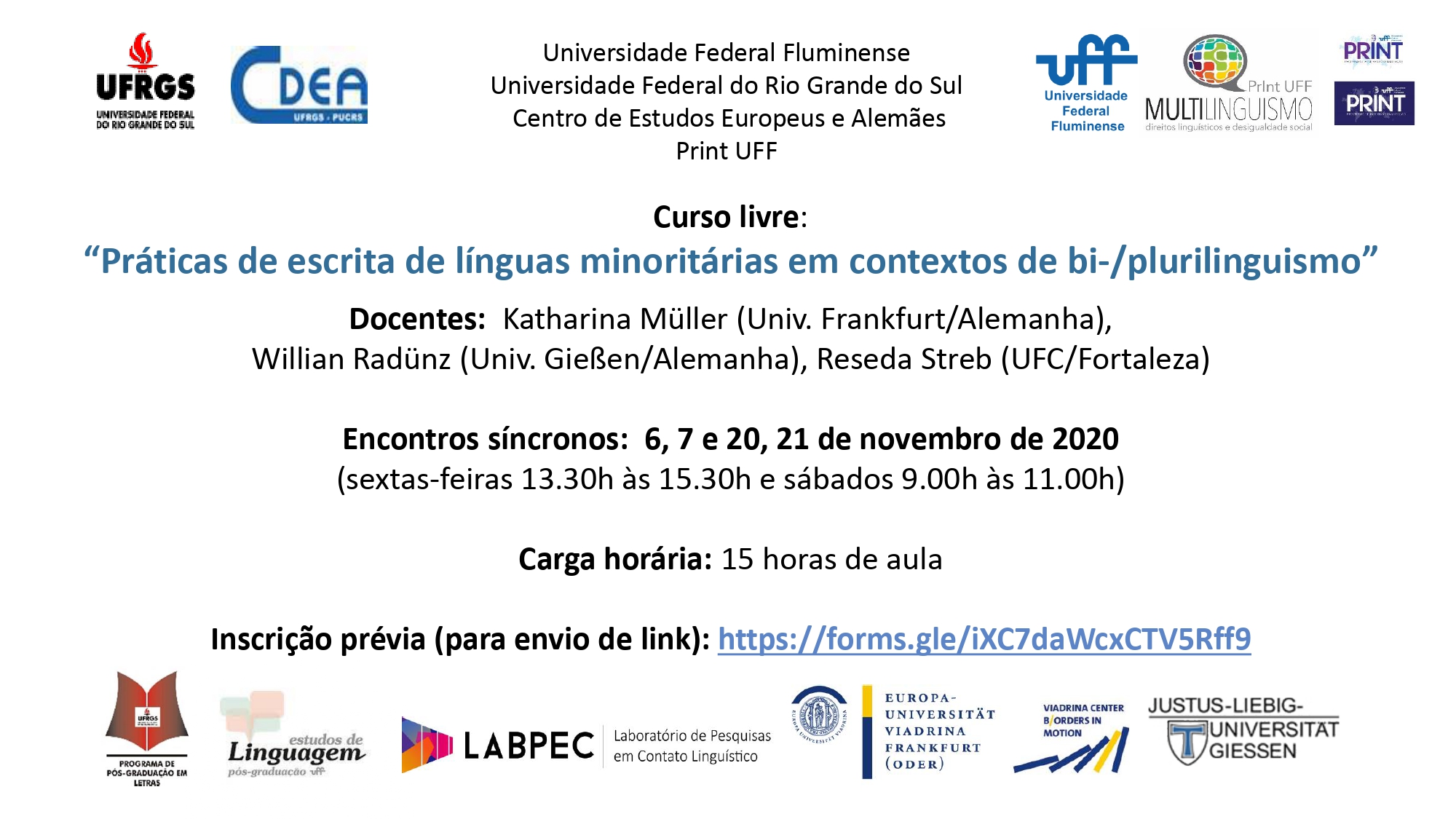 Nos dias 6,7, e 20, 21 de novembro de 2020, ocorrerá o curso livre “Práticas de escrita de línguas minoritárias em contextos de bi-/plurilinguismo” – parceria entre a Universidade Federal Fluminense, Universidade Federal do Rio Grande do Sul e o Centro de Estudos Europeus e Alemães. O curso apresenta a seguinte ementa: