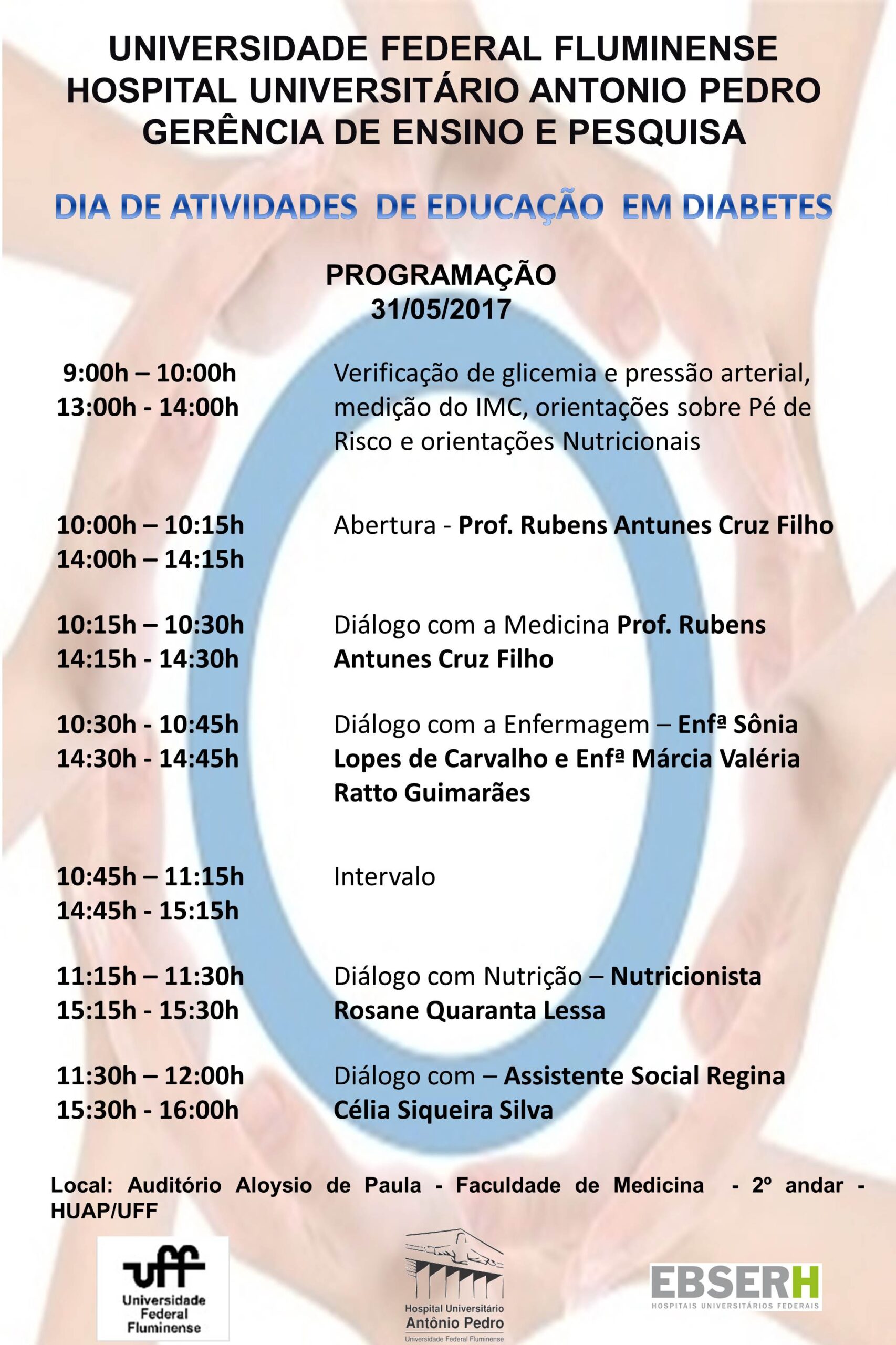 O Hospital Universitário Antonio Pedro (Huap) irá participar do mutirão através de ações educativas sobre a diabetes. Entre as atividades programadas estão incluídas a verificação de glicemia e pressão arterial, medição do índice de massa corporal (IMC), orientações sobre pé de risco e orientações nutricionais.