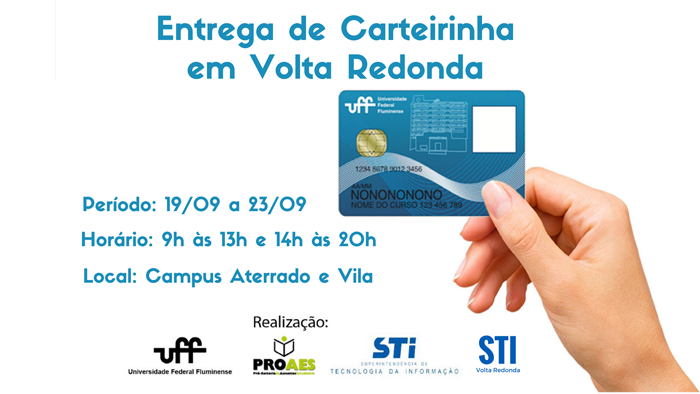 A UFF realizará, entre os dias 19 e 23/09, a entrega das carteirinhas universitárias em Volta Redonda. A ação acontecerá no Campus Aterrado e Vila, durante toda a semana. O aluno deve estar atento ao recebimento do e-mail. Apenas os que receberam o comunicado estarão aptos a fazer a retirada.