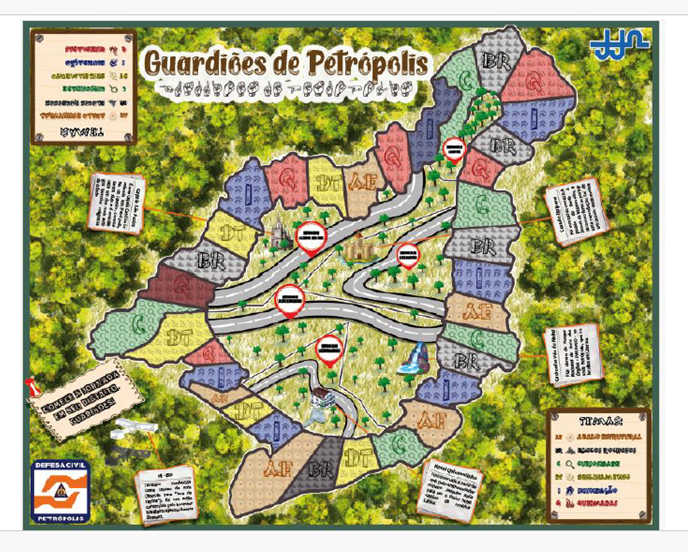 Um grupo de alunos do curso de Engenharia de Produção da Escola de Engenharia de Petrópolis da Universidade Federal Fluminense desenvolveu, como parte de uma atividade curricular, um jogo de tabuleiro para ensinar, para crianças da rede pública de ensino, ações preventivas e de reação para casos de tragédias climáticas e geológicas. O jogo, chamado Guardiões de Petrópolis, é basicamente uma corrida, onde a pista passa por todos os distritos da cidade e para avançar o jogador precisa responder corretamente a perguntas relacionadas a inundações, deslizamentos, incêndios, rotinas de segurança, ações preventivas, além de aspectos turísticos e históricos da cidade.