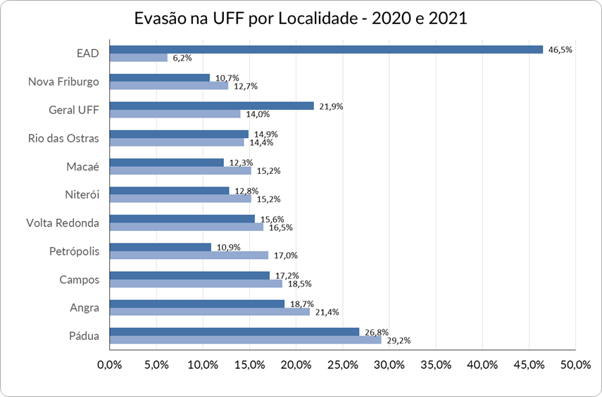 Em relação à Universidade Federal Fluminense, conforme dados extraídos do Censo da Educação Superior para a realização dos cálculos, os cursos de graduação à distância apresentaram um índice de evasão bem menor do que os cursos presenciais. O gráfico a seguir demonstra os índices obtidos em 2021 nos cursos ead em geral e nas localidades onde a UFF oferece cursos presenciais: