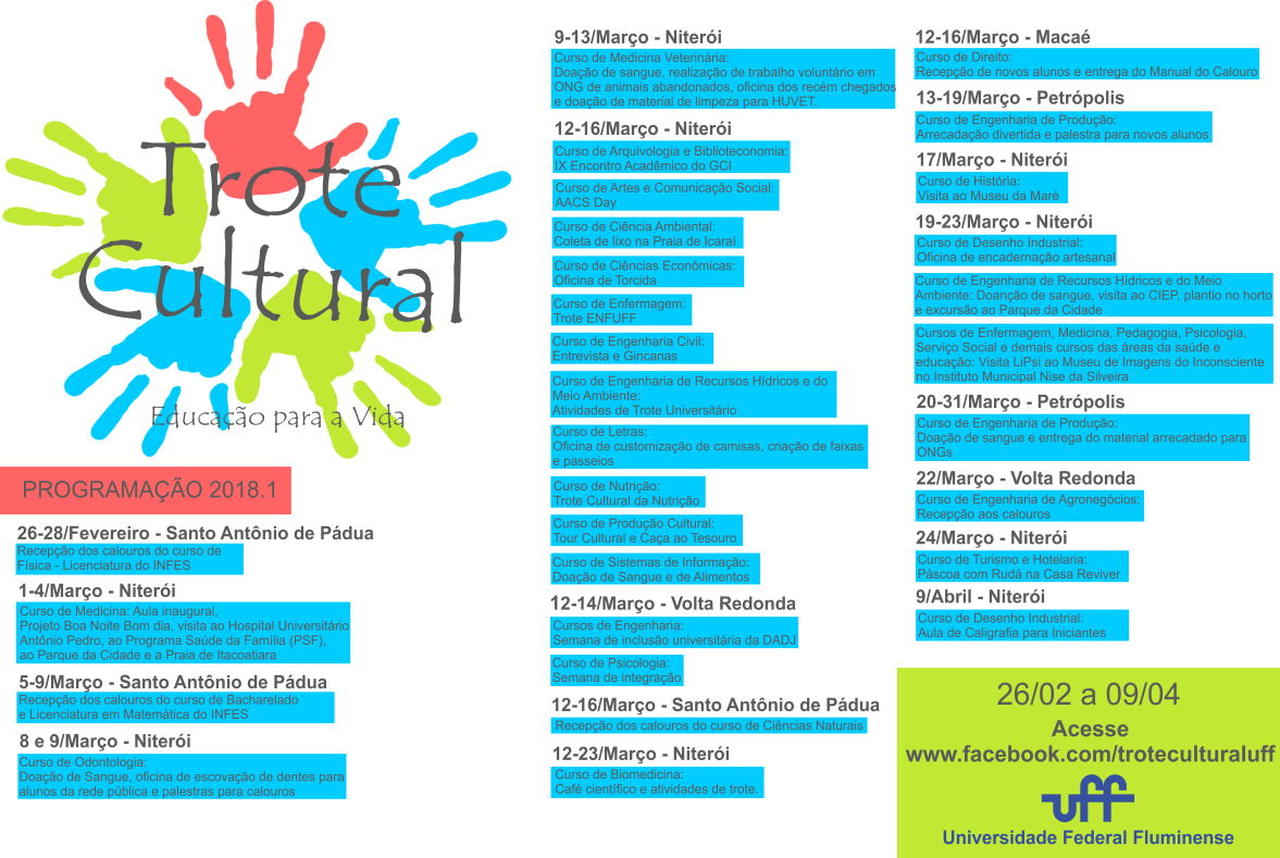 Esse semestre, contamos com a participação de 41 cursos de 5 Unidades Acadêmicas da UFF (Macaé, Niterói, Petrópolis, Santo Antônio de Pádua e Volta Redonda) na programação do Trote, que vai do dia 26 de fevereiro até 9 de abril.