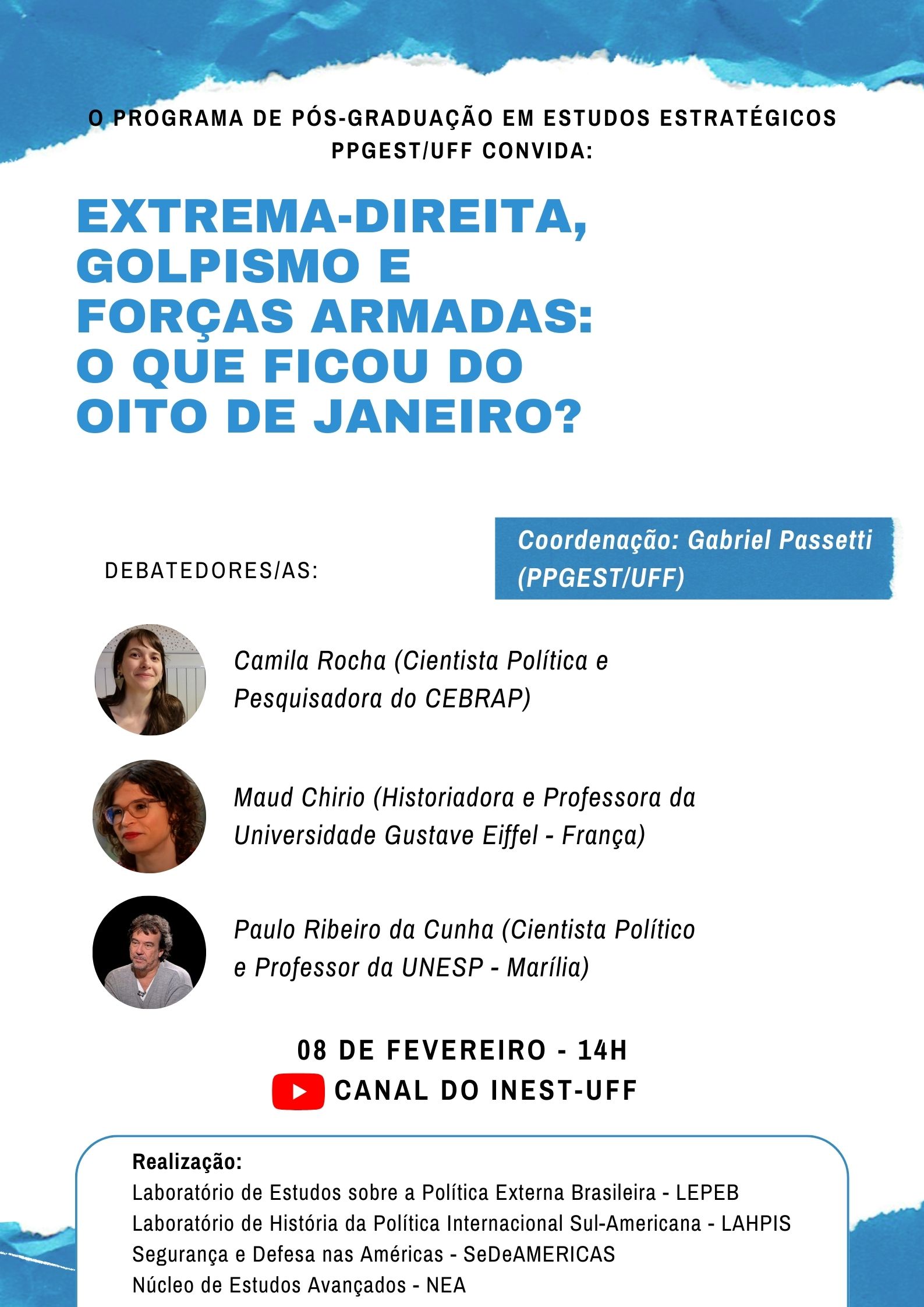 No dia 08 de fevereiro, quarta-feira, exatamente um mês depois dos atos golpistas ocorridos em Brasília, a PPGEST realizará um debate para analisarmos e refletirmos sobre eles. O evento acontecerá às 14h, em formato remoto, com transmissão pelo canal do INEST no YouTube e se intitula: “Extrema-Direita, Golpismo e Forças Armadas: o que ficou do Oito de Janeiro?”.