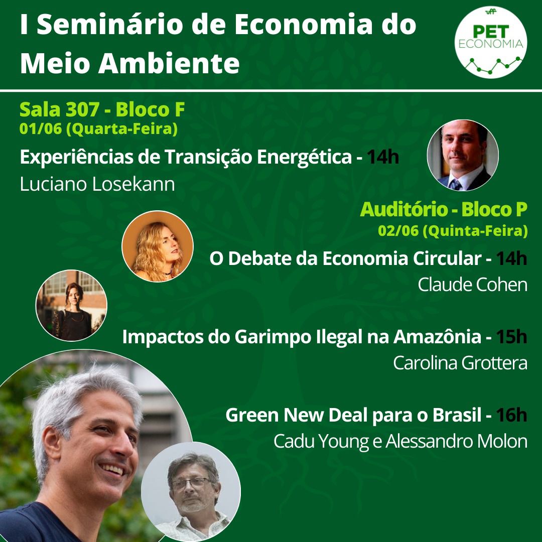 O evento, repartido em dois dias (01 e 02 de junho), contará com os professores e especialistas em Meio Ambiente da Faculdade de Economia Luciano Losekann, Claude Cohen e Carolina Grottera.