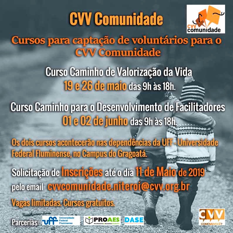 Os Cursos para capacitação de voluntários desenvolvidos pelo Centro de Valorização da Vida (CVV) em parceria com a DASE/PROAES ocorrerão no Campus do Gragoatá .