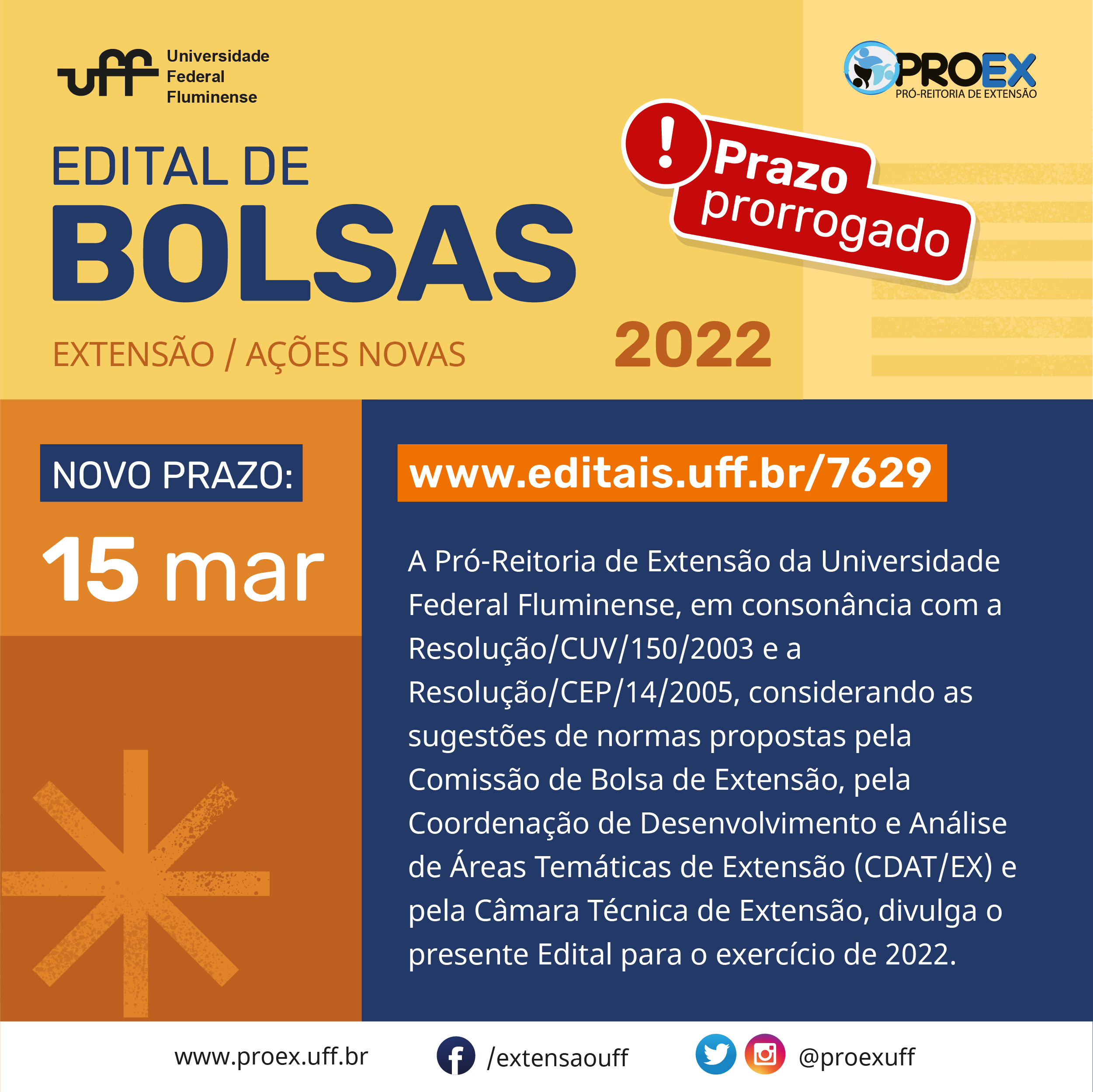 #ProexEmAção comunica aos coordenadores extensionistas que o prazo do cronograma publicado no Edital de Ações Novas, foi prorrogado até o dia 15/03/2022