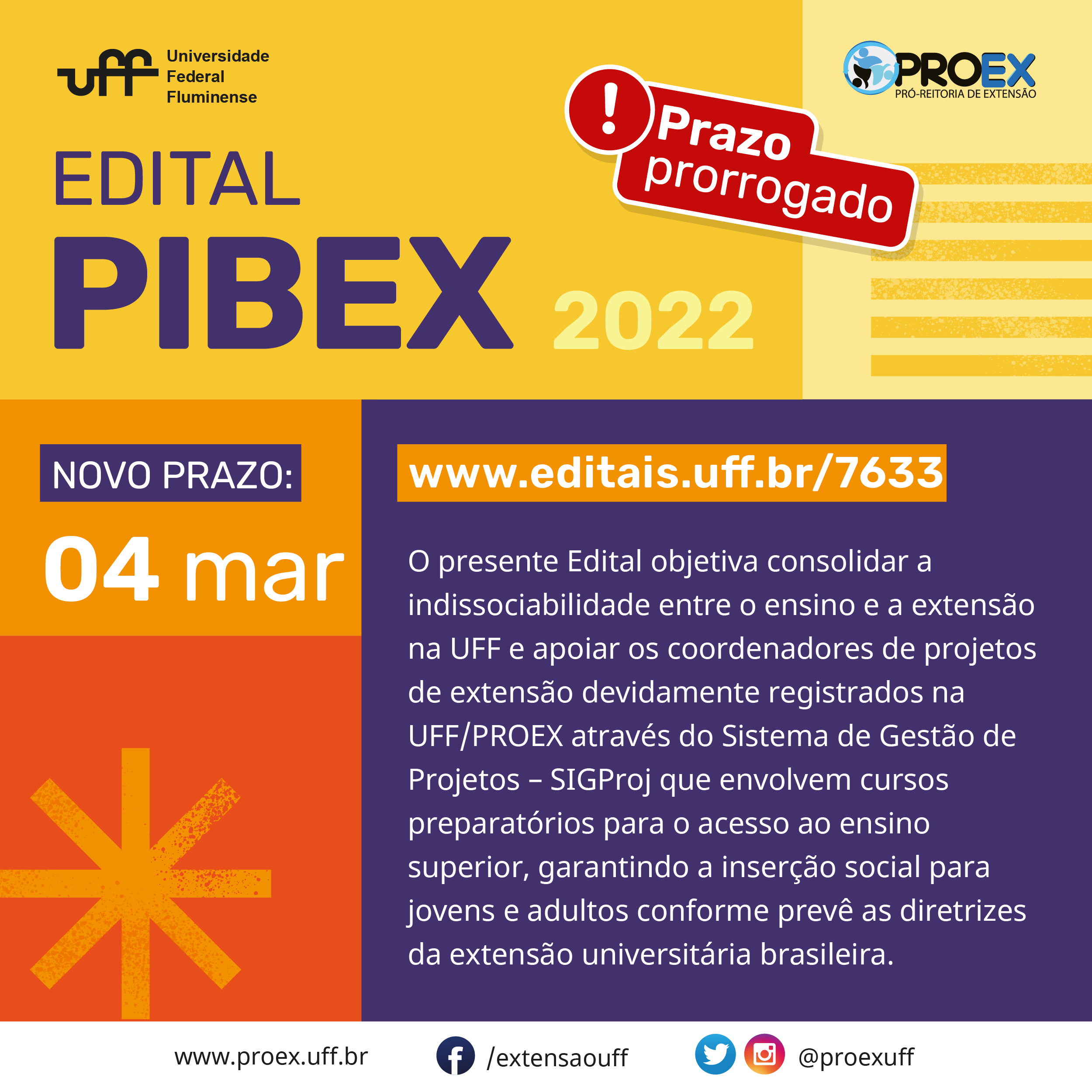 #ProexEmAção comunica aos coordenadores extensionistas que o prazo do cronograma publicado no Edital PIBEX – Pré-Universitário Social 2022, foi prorrogado até o dia 04/03/2022