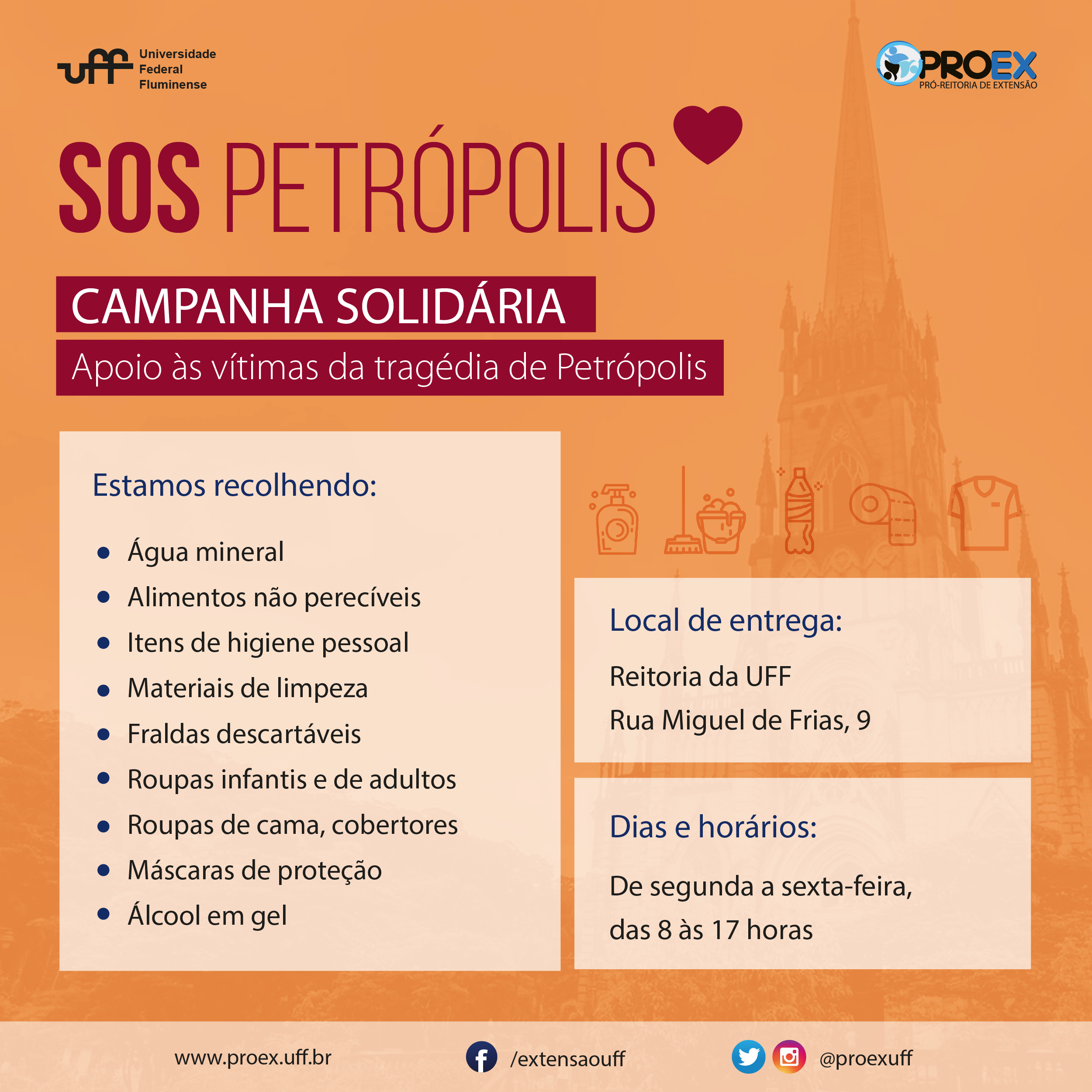 #ProexEmAção Atenção! A Pró-Reitoria de Extensão a Universidade Federal Fluminense – UFF, está coordenando a Campanha Solidária “SOS Petrópolis” para às vítimas da tragédia. Informamos que a Defesa Civil de Petrópolis agradece as doações e comunica que não há mais a necessidade da doação de roupas. Continuem contribuindo com os demais itens! As doações serão entregues no saguão da Reitoria – UFF em Icaraí até o dia 24/02 das 8h às 17h de segunda a sexta-feira.