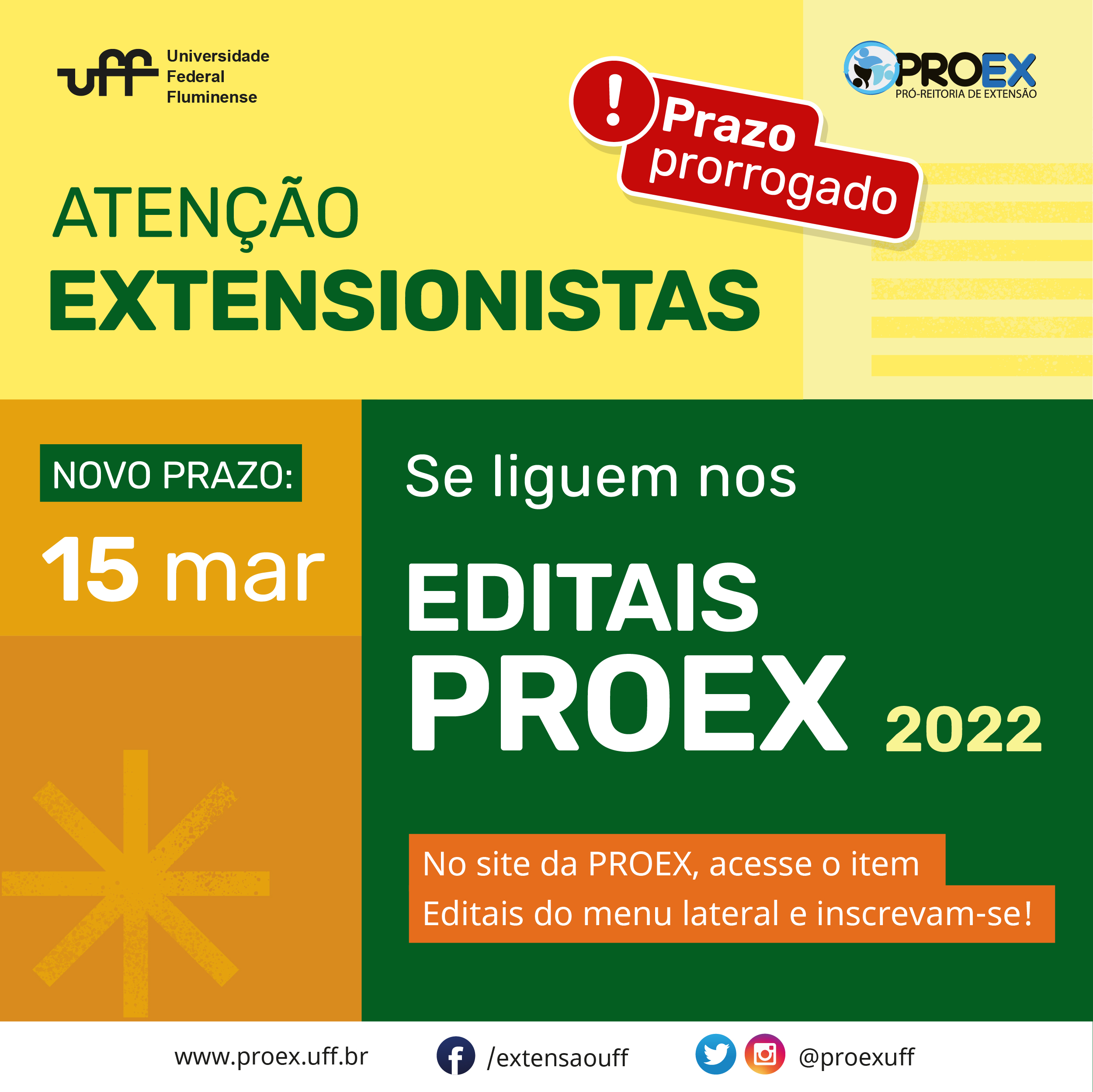 #ProexEmAção A Pró-Reitoria de Extensão – UFF divulga que estão  disponíveis as inscrições para os Editais: “Edital Bolsa de Extensão 2022 – AÇÕES RENOVADAS, ““Edital Bolsa de Extensão  – AÇÕES NOVAS” e “UFF – Edital PIBEX – Pré-Universitário Social” tendo como principal meta auxiliar as atividades de extensão desenvolvidas no âmbito da PROEX-UFF, para o ano de 2022. O prazos para as inscrições vão até o dia 15/03/2022.