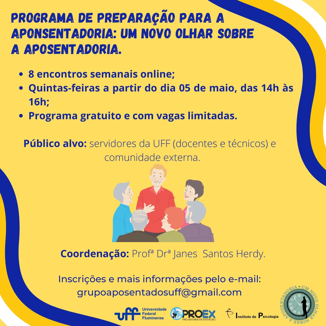 anteriormente, Coordenação: Profª Drª Janes Santos Herdy. Inscrições e mais informações pelo e-mail: grupoaposentadosuff@gmail.com. Por fim, no inferior do card, já abaixo de tudo, encontram-se as imagens das logos da UFF, da PROEX, do Instituto de Psicologia e do Programa de Preparação para a Aposentadoria (PPA).Fim da descrição.