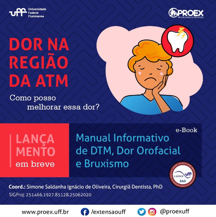 #ProexEmAção divulga que a Clínica de DTM e Dor Orofacial em parceria com a Pró-Reitoria de Extensão, em breve fará o lançamento do e-Book do Manual Informativo de DTM, Dor Orofacial e Bruxismo, coordenado pela extensionista professora Simone Saldanha Inácio de Oliveira da Faculdade de Odontologia – UFF. O Manual informativo desenvolvido pela equipe da Clínica de DTM e Dor Orofacial com orientações e autocuidados, é composto por uma linguagem acessível que poderá ser usado como ferramenta de auxilio nos sinais e sintomas.
