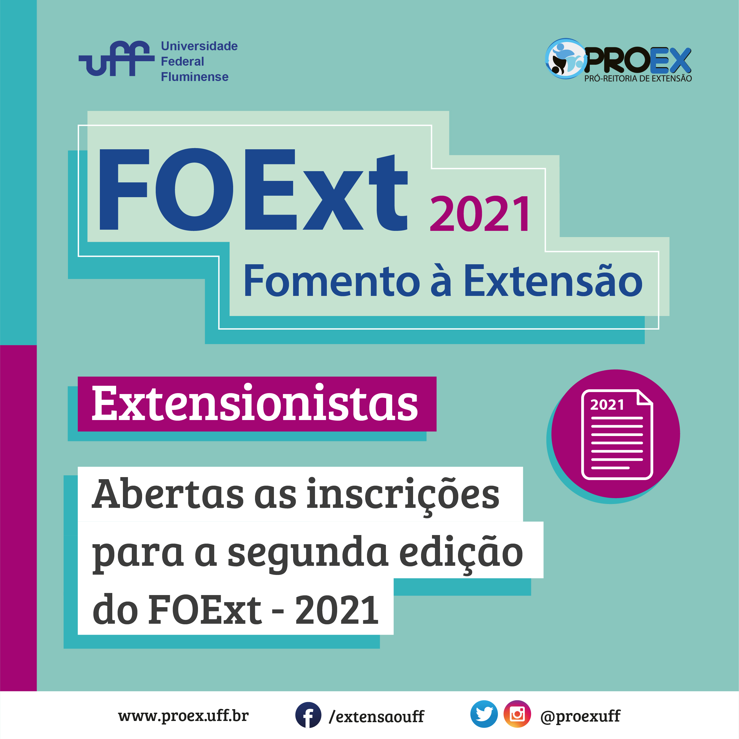 #ProexEmAção divulga que estão abertas as inscrições para a segunda edição do FOExt: edital de apoio a projetos de extensão, que tem como principal meta apoiar as atividades de extensão desenvolvidas no âmbito da UFF. Para o ano de 2021, a chamada tem o valor de R$ 250.000,00 (duzentos e cinquenta mil reais), de acordo com a disponibilidade orçamentária, e está direcionada à aquisição de material de consumo e pequenos serviços realizados por Pessoas Jurídicas (PJ).CRONOGRAMA PARA REGISTRO DAS AÇÕES DE EXTENSÃO- 30/06/2021 a 21/07/2021 – Prazo para registro da Ação de Extensão nosistema SIGProj PROEX.