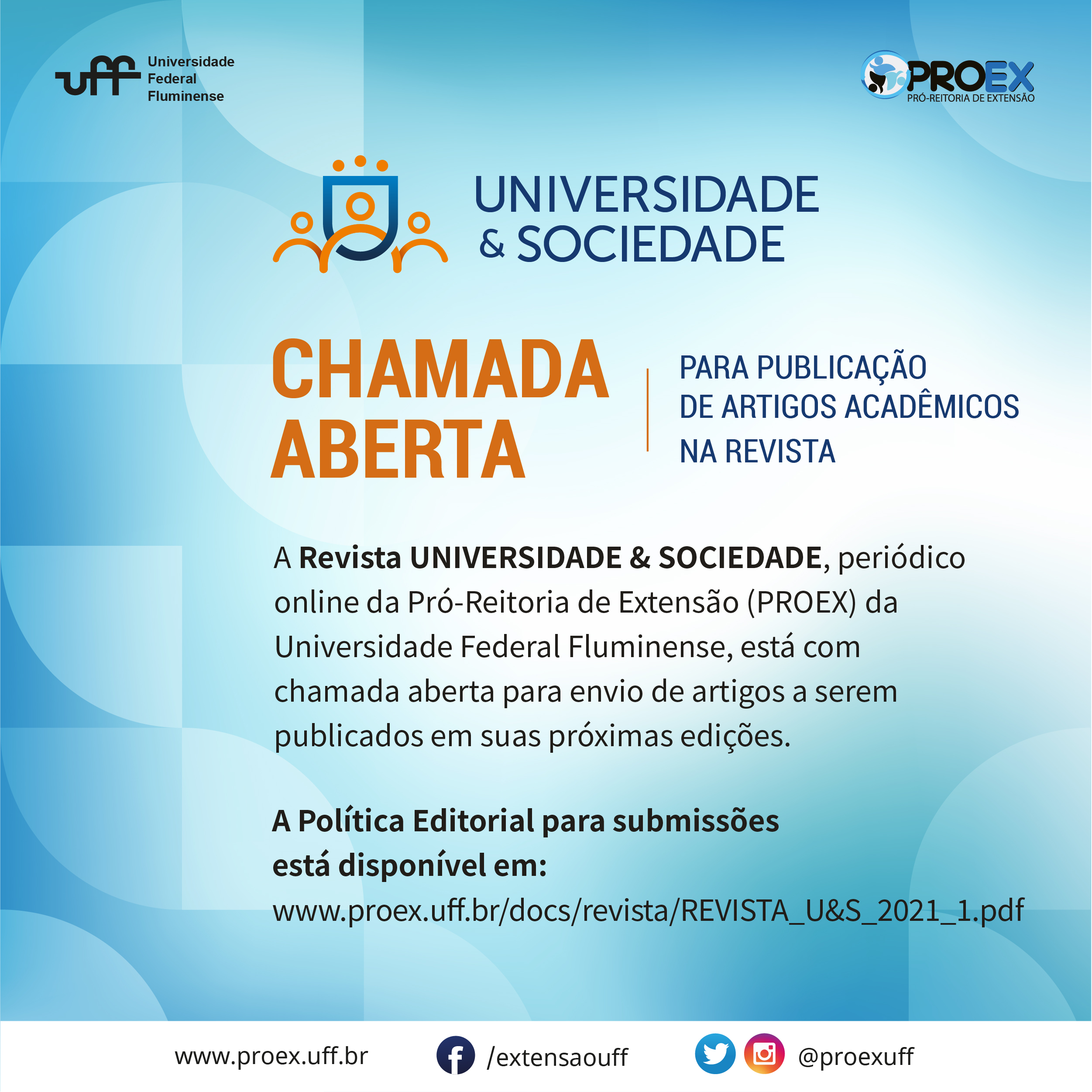 #ProexEmAção informa que a Revista UNIVERSIDADE & SOCIEDADE, periódico online da Pró-Reitoria de Extensão (PROEX) da Universidade Federal Fluminense, está com chamada aberta para envio de artigos a serem publicados em suas próximas edições.Os trabalhos deverão estar de acordo com a Política Editorial da Revista, bem como com suas normas para submissão, e deverão ser encaminhados exclusivamente para o e-mail universidadesociedade.proex@id.uff.br. A referida Política Editorial está disponível na primeira edição da Revista, a qual pode ser acessada na página da PROEX no site da UFF em http://www.proex.uff.br/docs/revista/REVISTA_U&S_2021_1.pdfA Revista UNIVERSIDADE & SOCIEDADE é um periódico voltado para a divulgação científica de trabalhos acadêmicos sobre extensão universitária, e tem por objetivo contribuir para a construção de um espaço democrático de reflexão e debate acerca do tema e de suas implicações.Mais informações pelo e-mail universidadesociedade.proex@id.uff.br—