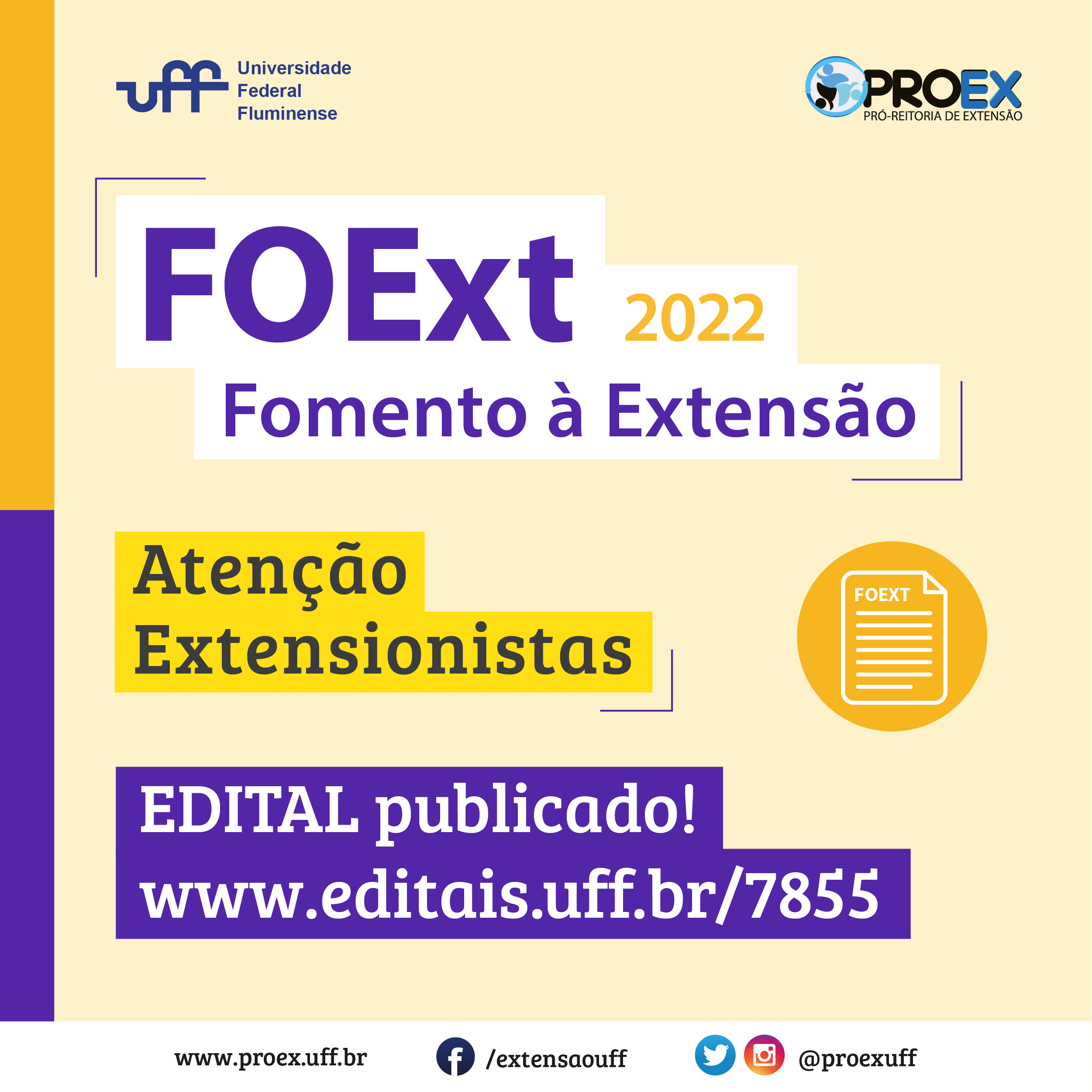 #ProexEmAção A Pró-Reitoria de Extensão informa que faltam poucos dias para o encerramento do Edital CHAMADA PARA FOMENTO A AÇÕES DE EXTENSÃO – 2022, que tem como principal meta auxiliar as atividades de extensão desenvolvidas no âmbito da PROEX-UFF, para o ano de 2022. O FOEXT tem como objetivos: – Apoiar os docentes da UFF com recursos financeiros básicos para o desenvolvimento de ações de extensão; – Incrementar a atividade extensionista na UFF. O edital encontra-se no Portal de Editais da UFF.