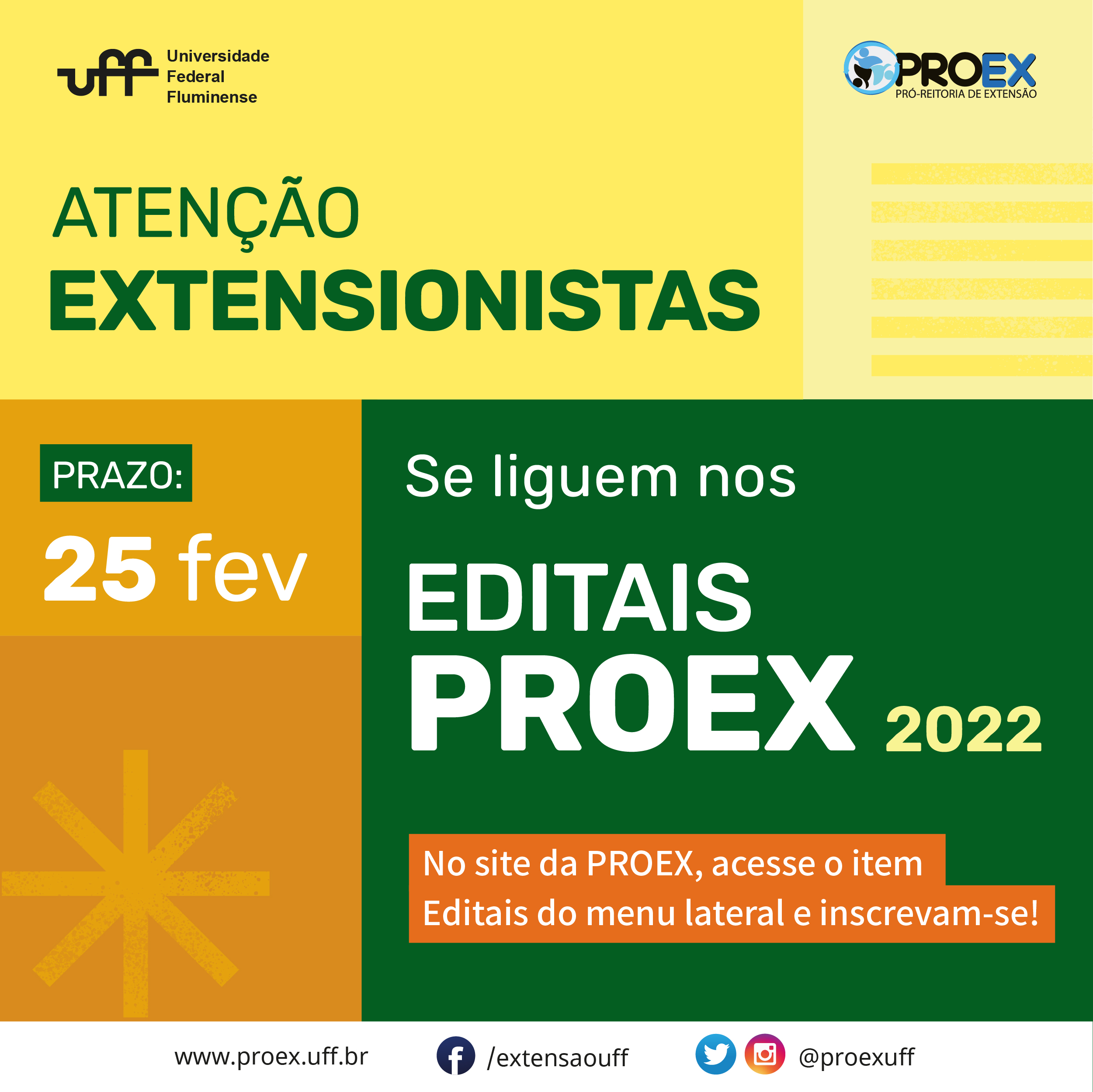#ProexEmAção informa a todos os coordenadores extensionistas e membros de ações de extensão da UFF, a participarem dos editais para bolsas novas, bolsas renovadas e bolsas PIBEX. Se liguem!