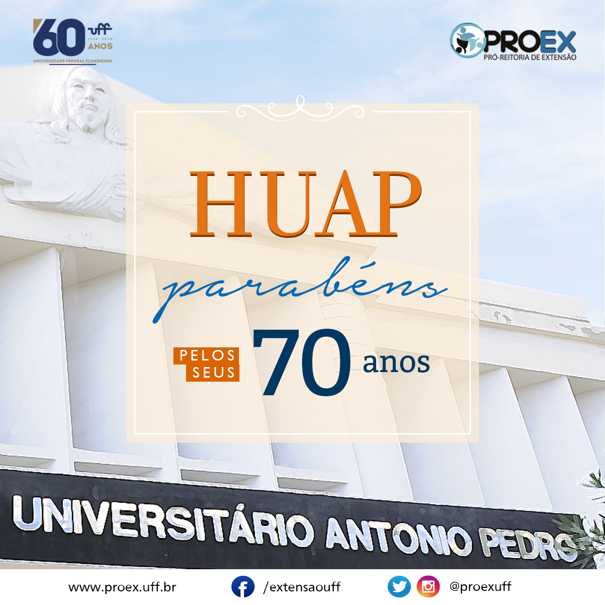#ProexEmAção parabeniza O Hospital Universitário Antonio Pedro (HUAP) que completou, no dia 15 de janeiro, 70 anos de atividades em prol da saúde pública do município de Niterói e do estado do Rio de Janeiro, e voltadas para o desenvolvimento científico não apenas da Universidade Federal Fluminense, mas de toda a sociedade enquanto estabelecimento hospitalar de referência. Localizado na região central de Niterói, na rua Marquês do Paraná, o HUAP conta hoje com cerca de dois mil profissionais das mais diversas áreas de atuação, entre professores e servidores da UFF, residentes, terceirizados e empregados públicos da Empresa Brasileira de Serviços Hospitalares (EBSERH). O Hospital é a maior e mais complexa unidade de saúde do município, e atende à população da Região Metropolitana II do estado, que abrange, além de Niterói, os municípios de São Gonçalo, Itaboraí, Tanguá, Maricá, Rio Bonito e Silva Jardim.