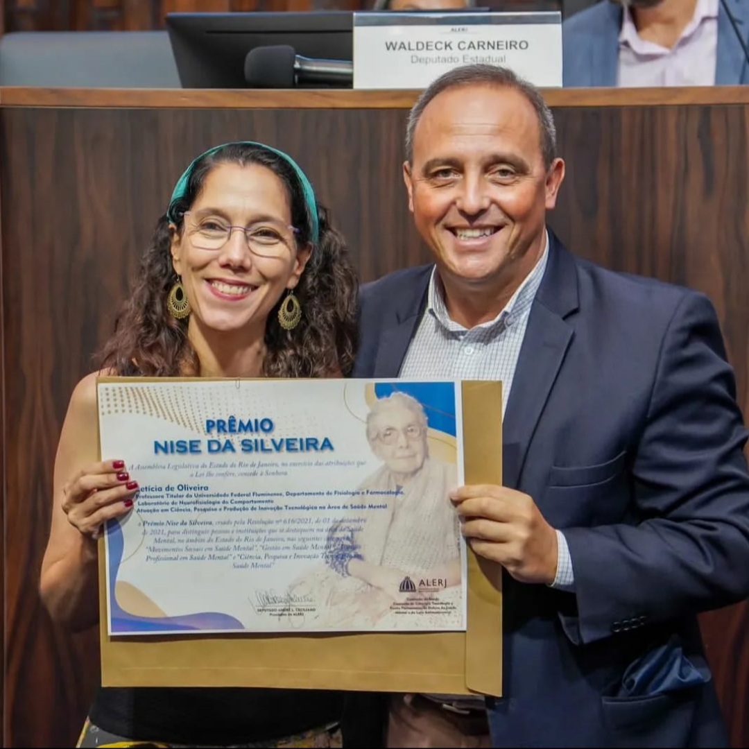 No último dia 12 de dezembro, ocorreu no Plenário da Assembleia Legislativa do Estado do Rio de Janeiro (Alerj) a primeira edição do Prêmio Nise da Silveira. A premiação foi instituída com o objetivo de homenagear pessoas e instituições que se destacaram na pauta da Saúde Mental e uma das agraciadas foi a professora Letícia de Oliveira, vinculada ao Departamento de Fisiologia e Farmacologia e ao Laboratório de Neurofisiologia do Comportamento (LABNEC) da UFF.