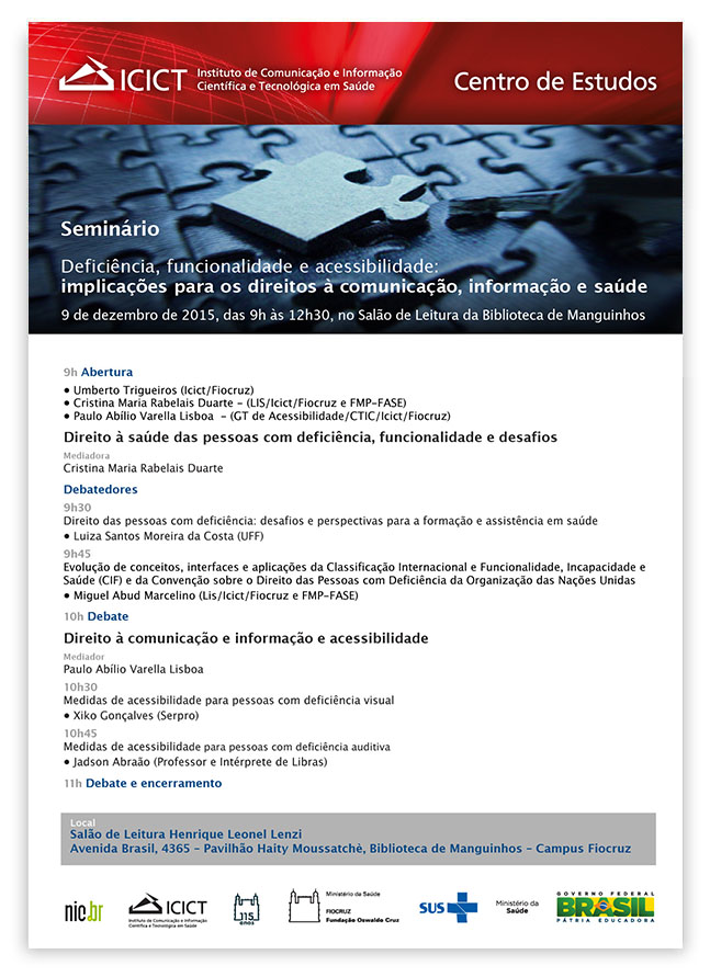 O encontro celebrará o Dia Internacional das Pessoas com Deficiência (3 de dezembro) e será a primeira atividade a pautar o tema de forma integral, promovendo medidas de acessibilidade. O objetivo é mobilizar a comunidade da Fiocruz e a sociedade em prol da implementação de práticas de comunicação mais acessíveis e da formulação de políticas públicas mais inclusivas que considerem a diversidade de necessidades da população. Haverá duas sessões de discussão: uma na qual será apresentado um panorama dos direitos das pessoas com deficiência, a legislação e os desafios no contexto da assistência em saúde; a outra será sobre medidas de acessibilidade comunicacional, na qual serão enfatizados os recursos necessários para pessoas com deficiências auditivas e visuais.