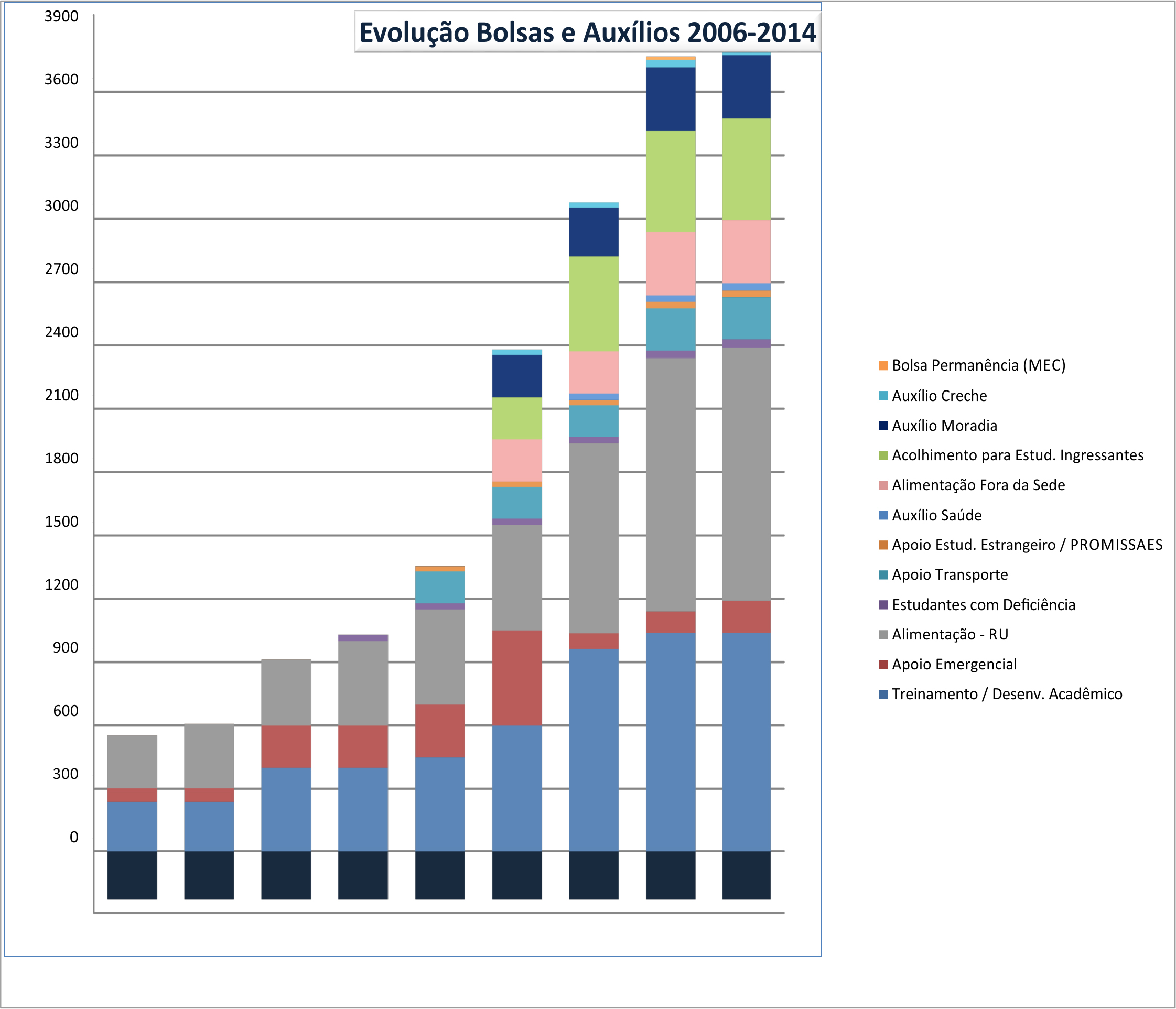 A evolução mais significativa entre os anos de 2006 e 2014 ocorreu na bolsa-alimentação (de 250 para 1.200) e na bolsa de desenvolvimento acadêmico (238 para 1.040). Nesta última, após a avaliação socioeconômica, o beneficiado escolhe um projeto com o qual se identifique. Assim, o professor responsável acompanha o desempenho do aluno na vida acadêmica, orientando sua trajetória. Já o auxílio-alimentação permite que o estudante fique isento do pagamento da refeição fornecida restaurantes universitários, os chamados bandejões.