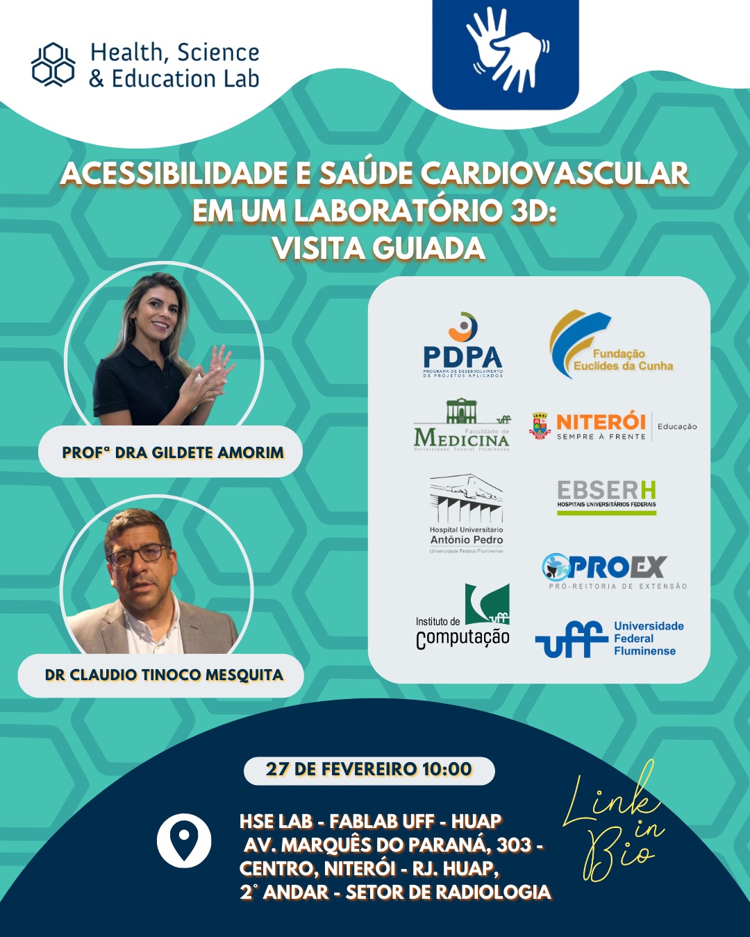 A Universidade Federal Fluminense, por meio do Fab Lab Health, Science & Education, laboratório de fabricação digital situado no Hospital Universitário Antonio Pedro (Huap), realiza no próximo dia 27 de fevereiro duas visitas guiadas com pessoas surdas visando aumentar o conhecimento desse público sobre as doenças cardiovasculares e suas formas de prevenção. O Fab Lab é uma iniciativa resultante do Programa de Desenvolvimento de Projetos Aplicados (PDPA), fruto da parceria entre a UFF, a Prefeitura de Niterói e a Fundação Euclides da Cunha (FEC).
