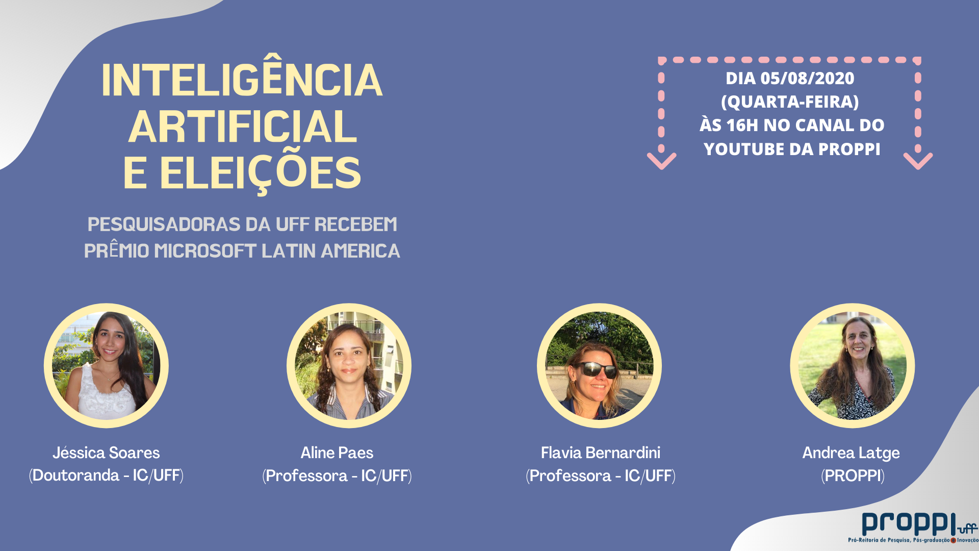 A partir disso, a Pró-Reitoria de Pesquisa, Pós-Graduação e Inovação convida a todos para a live “Inteligência Artificial e eleições: pesquisadoras da UFF recebem prêmio Microsoft Latin America” que terá a participação das 3 pesquisadoras e mediação da Pró-Reitora da PROPPI Andrea Latge.