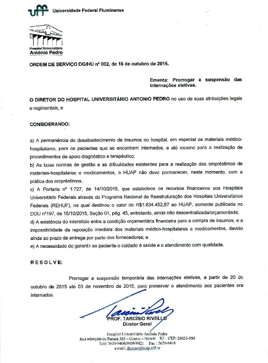 A direção do Hospital Universitário Antonio Pedro irá manter temporariamente suspensas as internações eletivas, a partir de 20 de outubro até 3 de novembro de 2015, devido a permanência do desabastecimento de insumos no hospital, em especial os materiais médico-hospitalares e até mesmo a dificuldade em realizar procedimentos de apoio diagnóstico e terapêutico .
