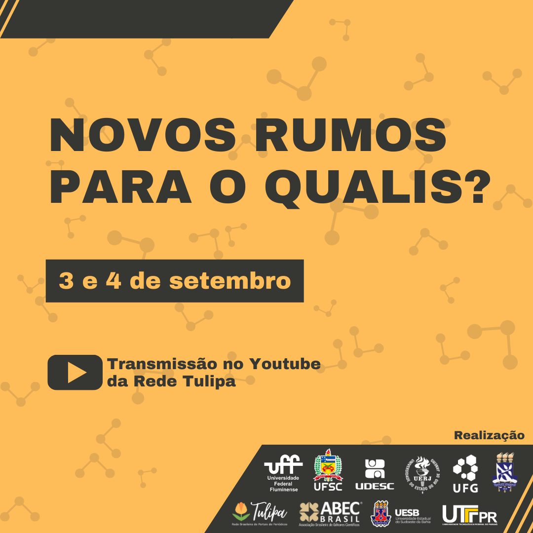 A ‘Rede Tulipa: Rede Brasileira de Portais de Periódicos’ (em especial: UFF, UFSC, UTFPR, UESB, UFBA, UDESC, UFG, UERJ) e a ‘Associação Brasileira de Editores Científicos’ (ABEC) promovem o debate do tema “Novos rumos para o Qualis Periódicos?” nos dias 3 e 4 de setembro de 2020.