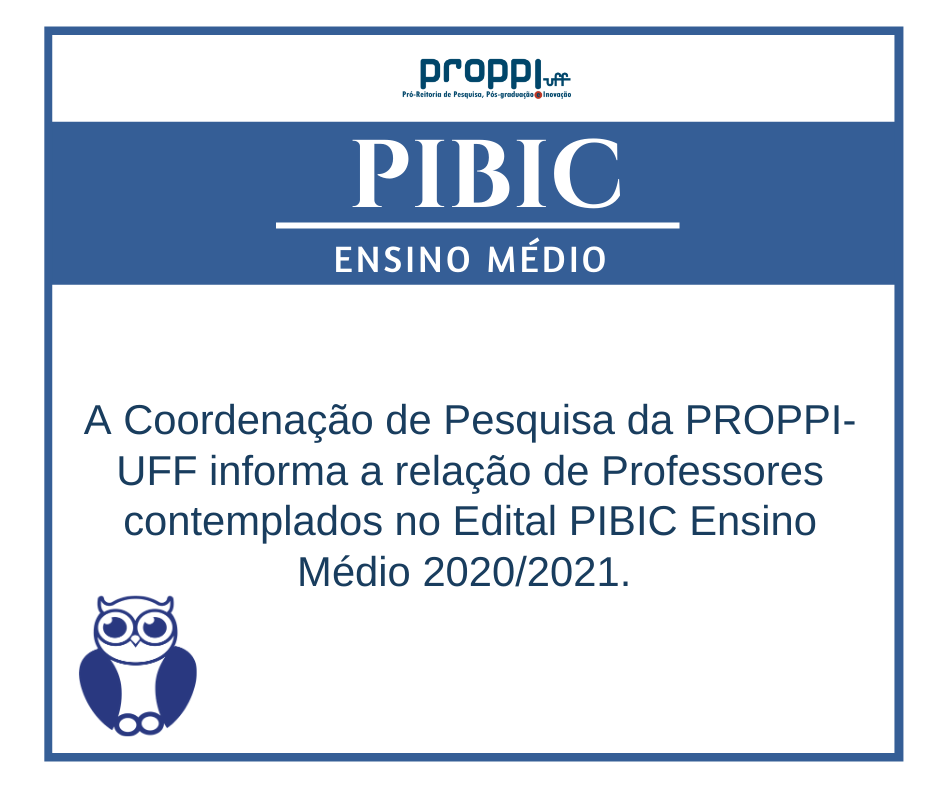 A Coordenação de Pesquisa informa a relação dos professores contemplados no Edital PIBIC Ensino Médio 2020/2021. O resultado final estará disponível a partir do dia 19 de maio de 2020.