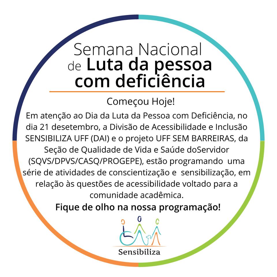 O objetivo principal do evento é dar visibilidade à questão da Acessibilidade e Inclusão na UFF, através de orientação à comunidade acadêmica e troca de relatos de experiência com os diversos setores da universidade que lidam com o tema.