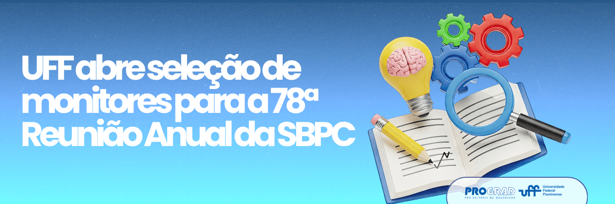 A UFF abriu inscrições para a seleção de estudantes interessados em atuar como monitores voluntários na 78ª Reunião Anual da Sociedade Brasileira para o Progresso da Ciência (SBPC). O processo seletivo é regido pelo edital disponível em: https://www.editais.uff.br/11287