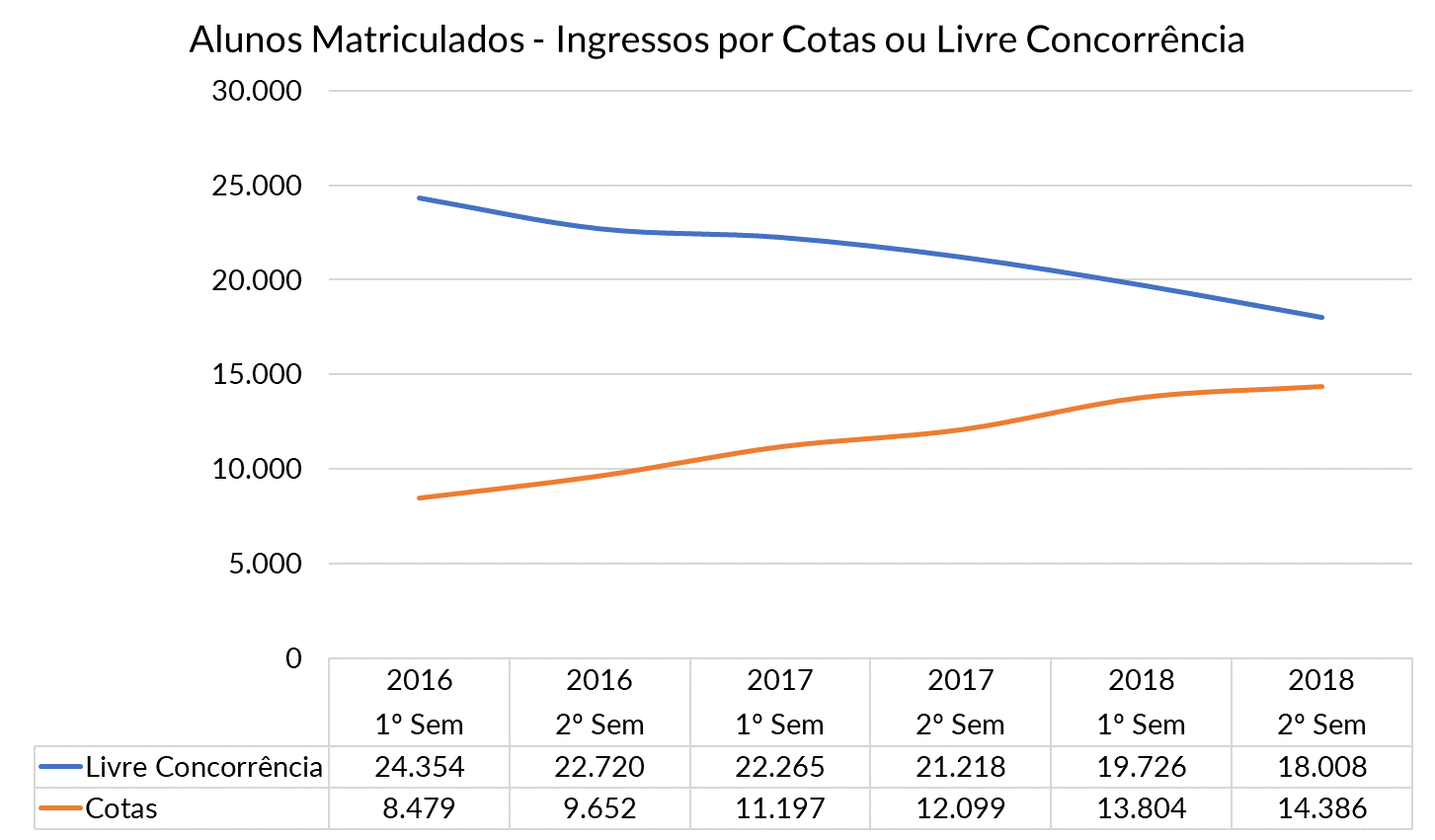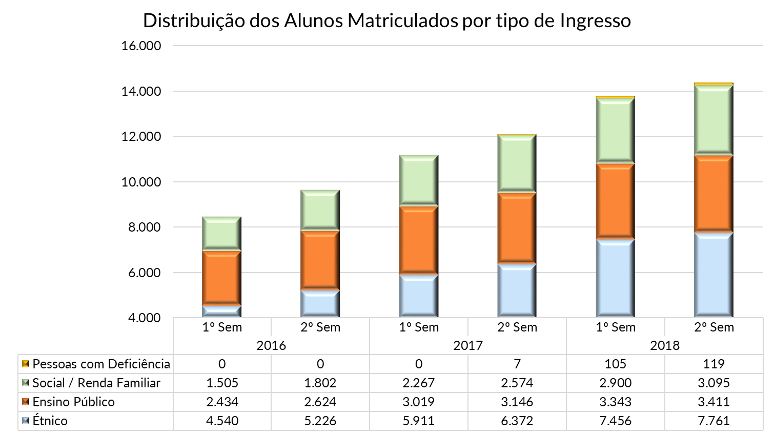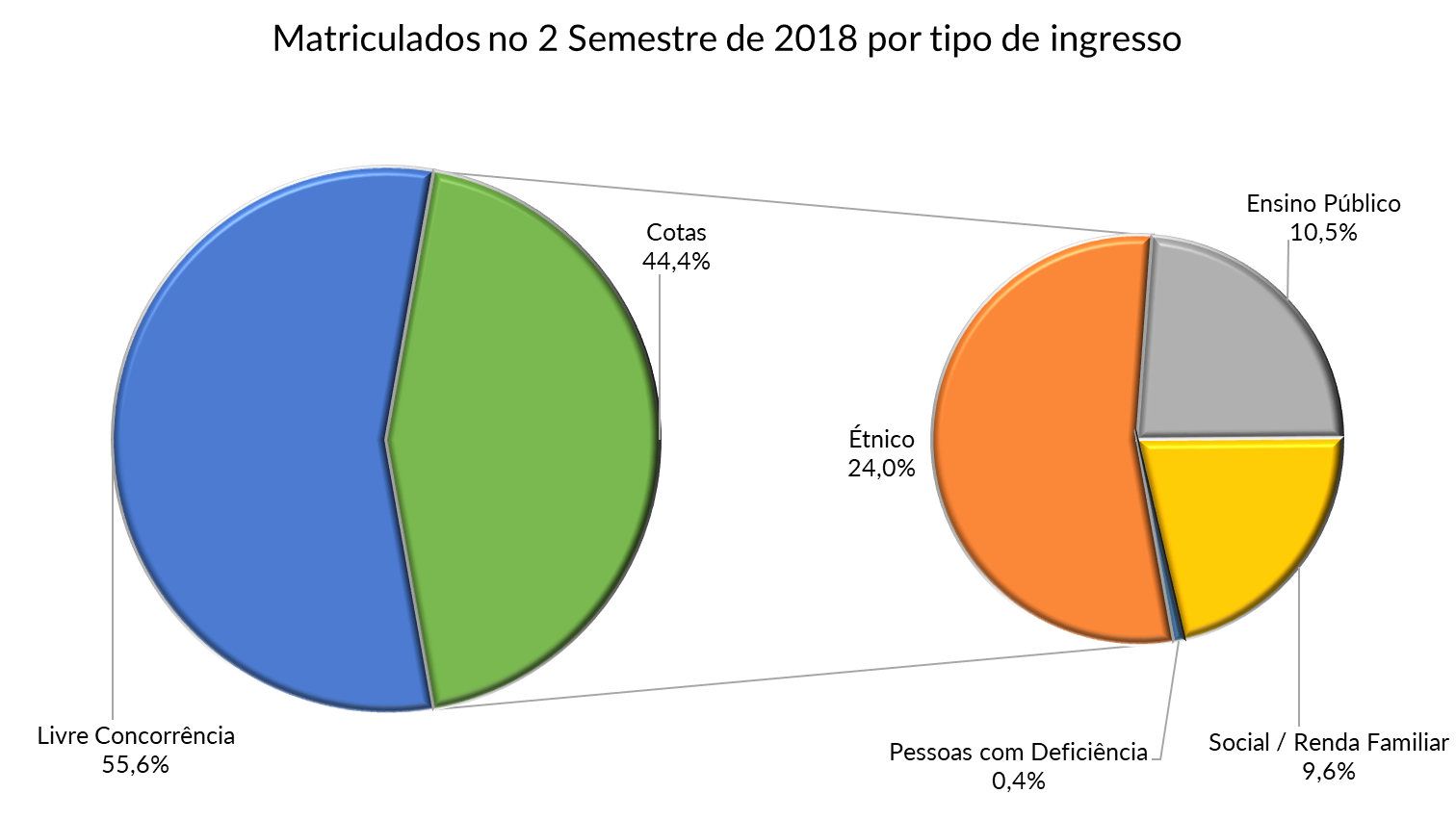 | Todos os alunos acima relacionados concluiram o Ensino Médio em Escola Públicas. A parcela indicada como Ensino Público relaciona apenas os alunos amparados EXCLUSIVAMENTE por este fato. No final do ano de 2016 a Lei 12.711 foi alterada pela Lei 13.409 de 28 de dezembro de 2016 que incluiu os alunos com deficiência. No segundo semestre de 2018 a UFF registrou 221 alunos com deficiência: 119 ingressantes via cotas e 102 através da livre concorrência. |