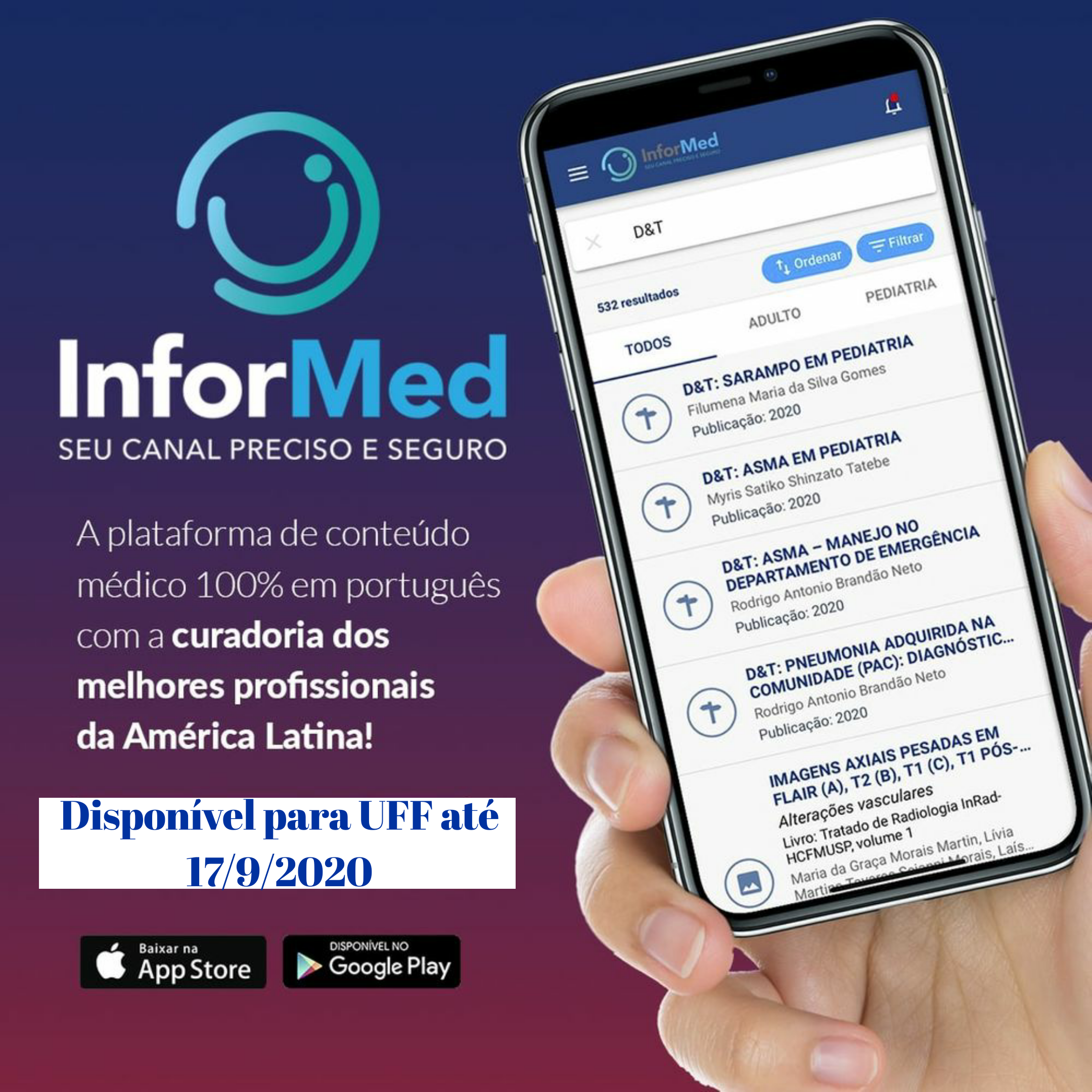 A Superintendência de Documentação (SDC) da UFF, por meio da Coordenação de Bibliotecas (CBI) viabilizou o acesso total e gratuito ao InforMed por 60 dias para todos os alunos, médicos, residentes, Professores e Preceptores e demais profissionais de saúde ligados à UFF.