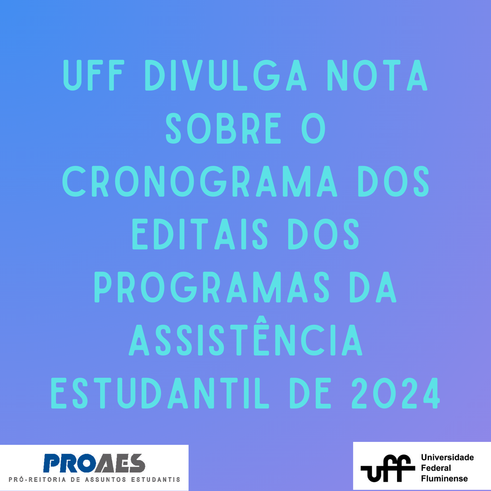 A Universidade Federal Fluminense, por meio da Pró- Reitoria de Assuntos Estudantis (Proaes), informa que será divulgado o cronograma retificado referente aos Editais dos Programas Estudantis no dia 08 de janeiro no site da UFF e no Instagram da Proaes.