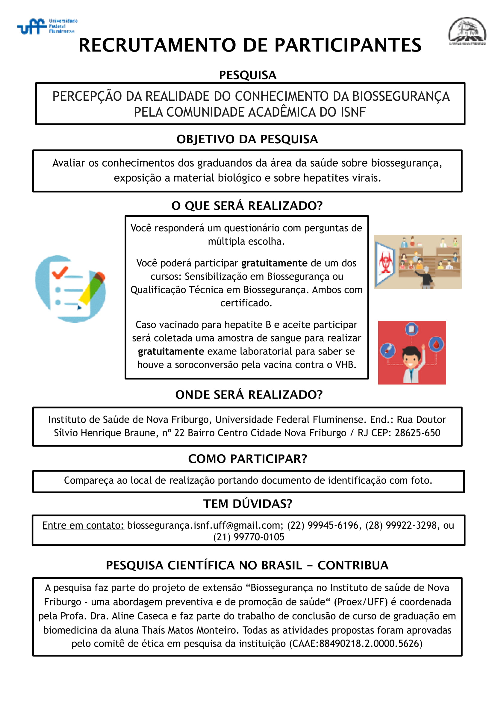 O Projeto de extensão “‘Biossegurança no Instituto de Saúde de Nova Friburgo – uma abordagem preventiva e de promoção de saúde’, que é coordenado pela professora Aline Caseca, está recrutando pessoas interessadas em participar da pesquisa “Percepção da realidade do conhecimento da biossegurança pela comunidade acadêmica do ISNF”.
