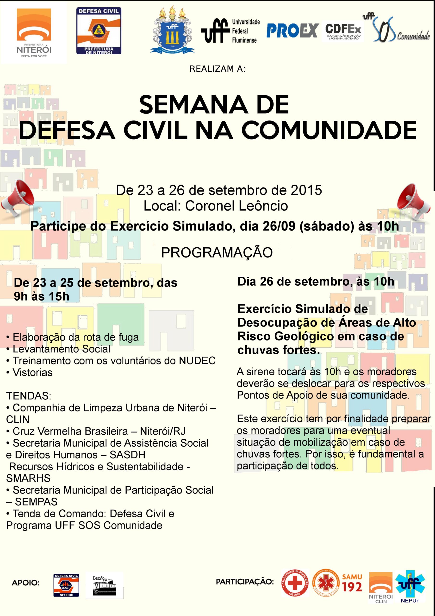 A Pró-reitoria de Extensão da Universidade Federal Fluminense, por meio do Programa de Extensão UFF SOS Comunidade, e a Secretaria de Defesa Civil/Prefeitura de Niterói realizarão no dia 26 de setembro, às 10 h. o Exercício Simulado de Desocupação de Áreas de Alto Risco Geológico da Comunidade Coronel Leôncio, Engenhoca – Niterói.