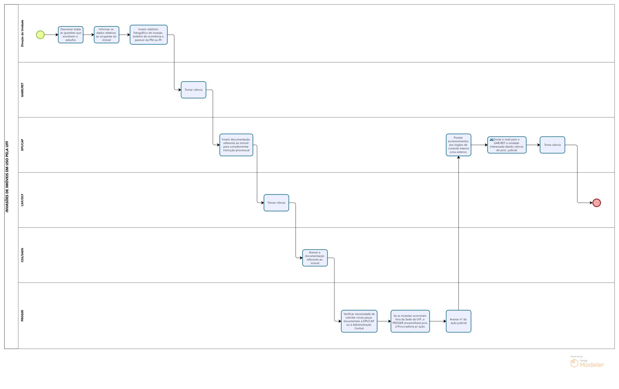 Trata-se de processo com os procedimentos a serem adotados diante de invasões (esbulhos) identificados em imóveis de propriedade da universidade, imóveis cedidos ou alugados por terceiros para utilização pela mesma.